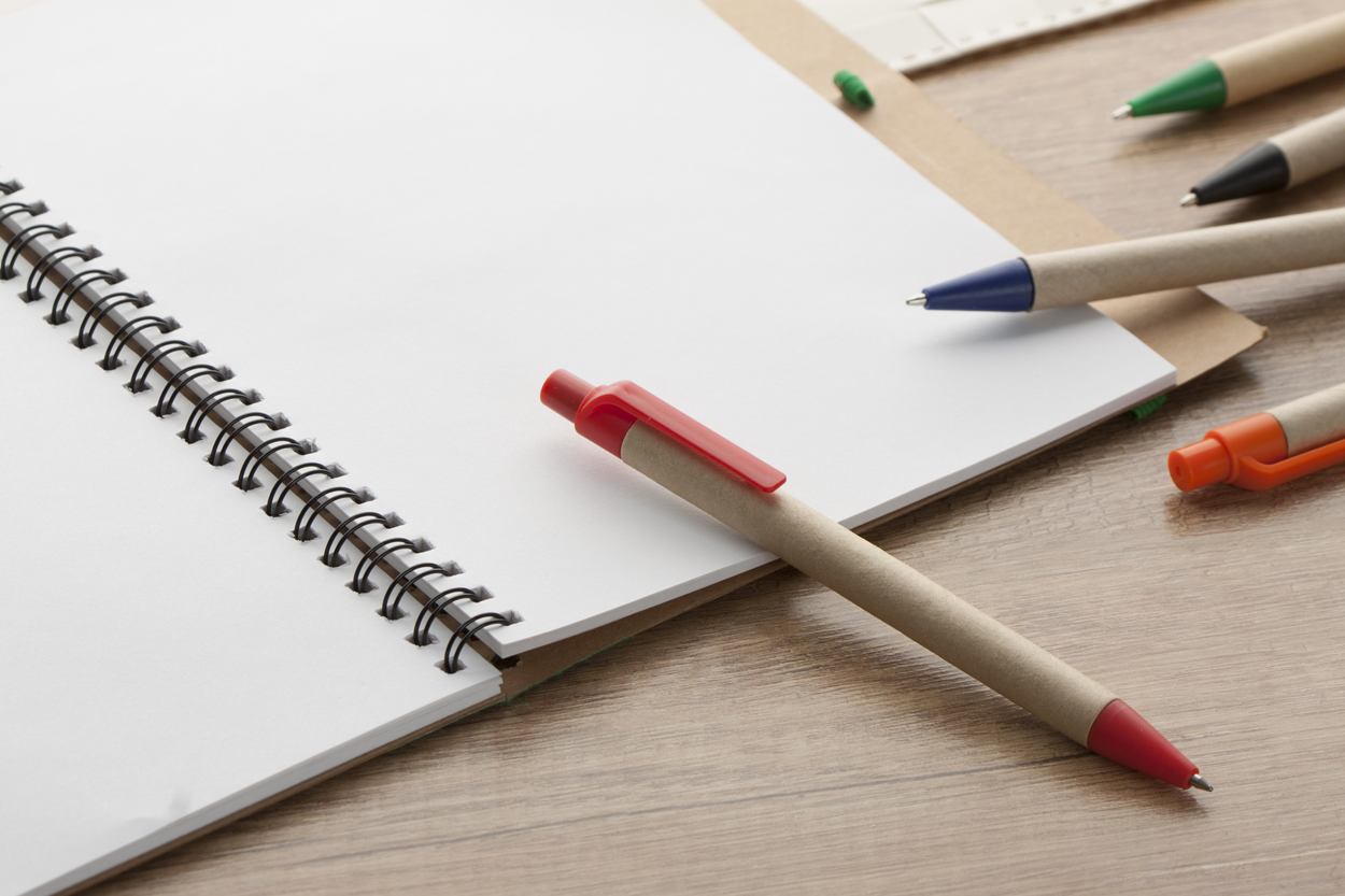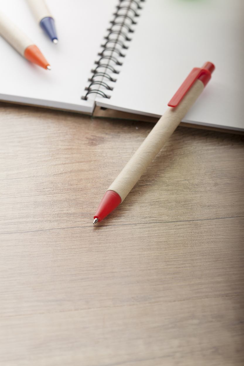 Kugelschreiber aus Recyclingpapier, blauschreibend.