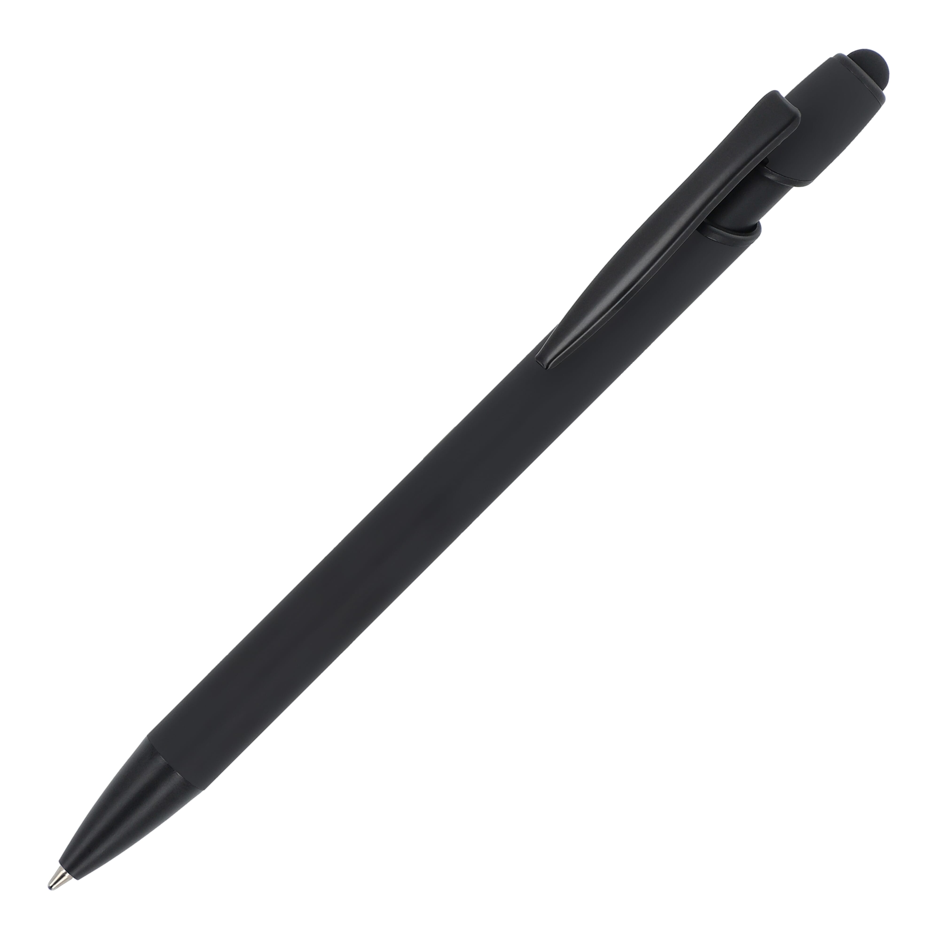 Kugelschreiber Paris aus recyceltem Aluminium mit Softtouch-Oberfläche. Der Kugelschreiber verfügt über eine Stylus-Funktion und schwarze Akzente. Mit blauer Schreibmine.