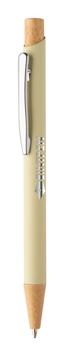 Kugelschreiber aus recyceltem Aluminium mit Bambus-Elementen, gummierter Oberfläche und verchromten Clip. Mit Spezialbeschichtung für Spiegelgravuren. Blauschreibend.