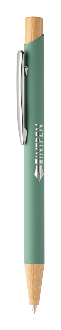 Kugelschreiber aus recyceltem Aluminium mit Bambus-Elementen, gummierter Oberfläche und verchromten Clip. Mit Spezialbeschichtung für Spiegelgravuren. Blauschreibend.