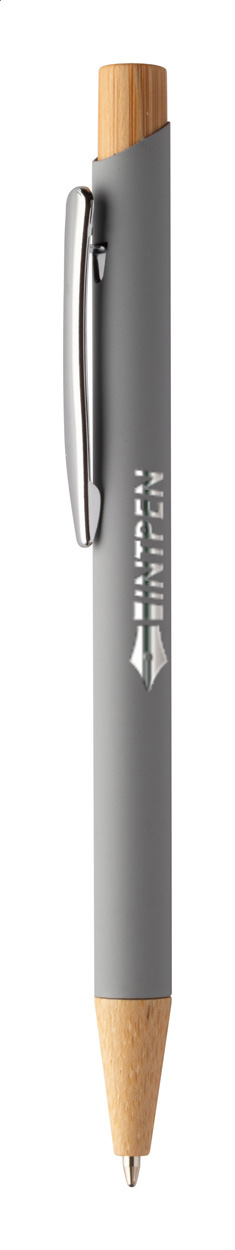 Kugelschreiber aus recyceltem Aluminium mit Bambus-Elementen, gummierter Oberfläche und verchromten Clip. Mit Spezialbeschichtung für Spiegelgravuren. Blauschreibend.