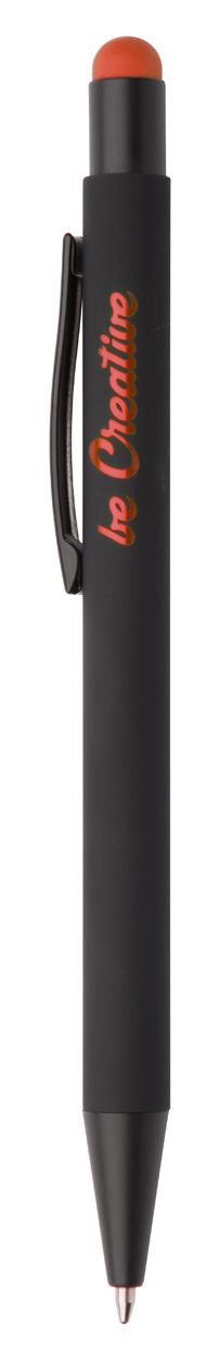 Aluminium-Kugelschreiber mit Touchpen und gummierter Oberfläche und Spezialbeschichtung für eine Farbgravur (Gravurfarbe abgestimmt mit Stylus), blauschreibend.