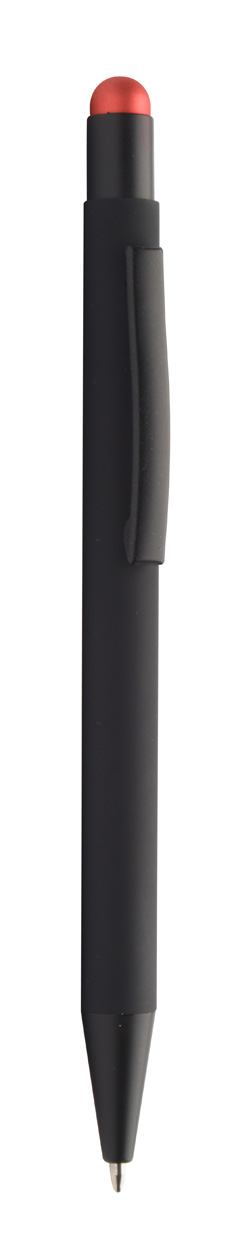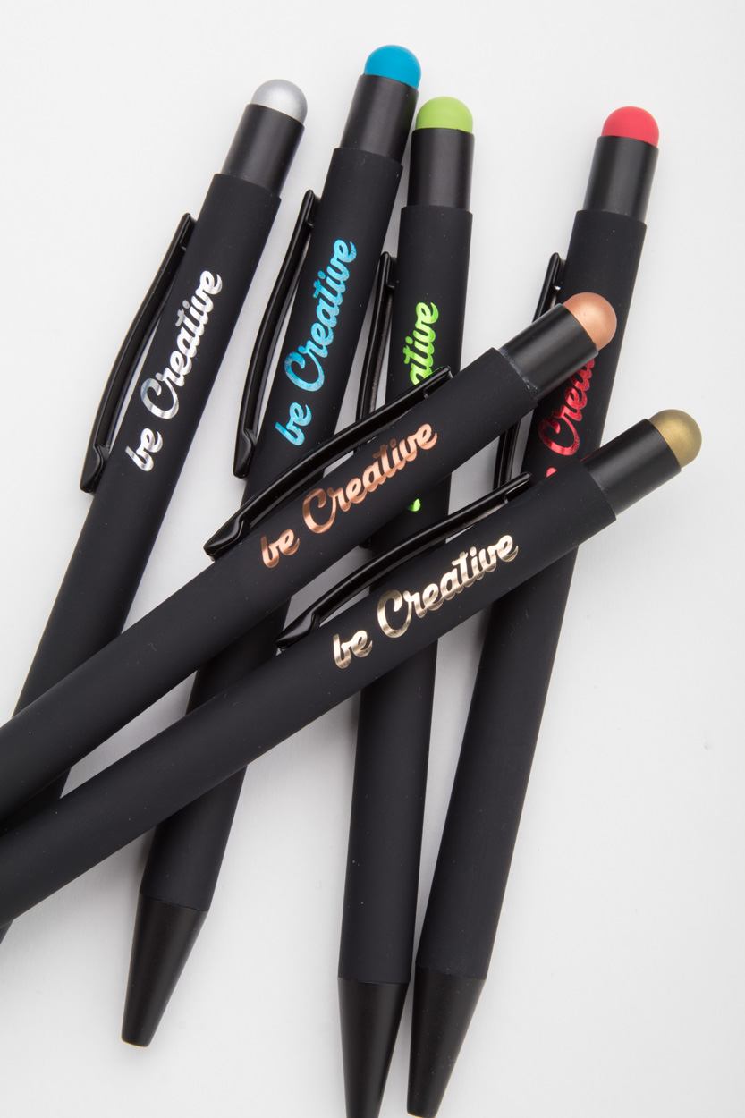 Aluminium-Kugelschreiber mit Touchpen und gummierter Oberfläche und Spezialbeschichtung für eine Farbgravur (Gravurfarbe abgestimmt mit Stylus), blauschreibend.