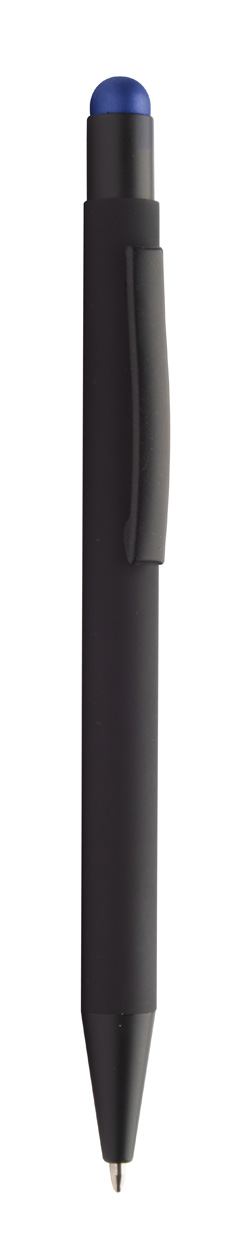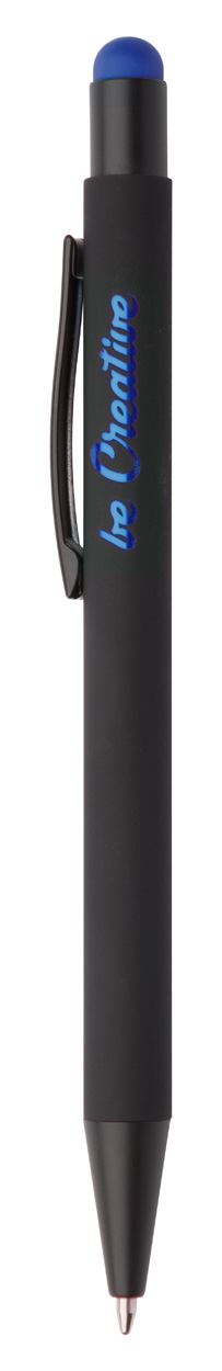 Aluminium-Kugelschreiber mit Touchpen und gummierter Oberfläche und Spezialbeschichtung für eine Farbgravur (Gravurfarbe abgestimmt mit Stylus), blauschreibend.