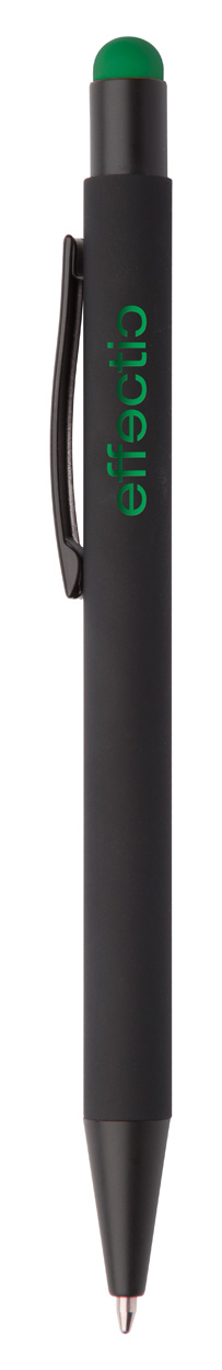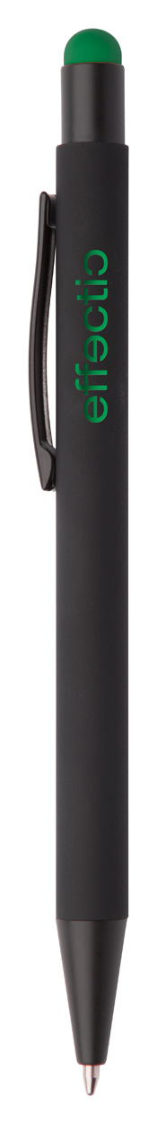 Aluminium-Kugelschreiber mit Touchpen und gummierter Oberfläche und Spezialbeschichtung für eine Farbgravur (Gravurfarbe abgestimmt mit Stylus), blauschreibend.