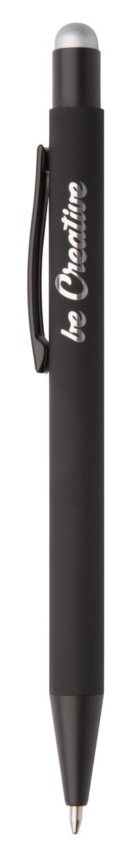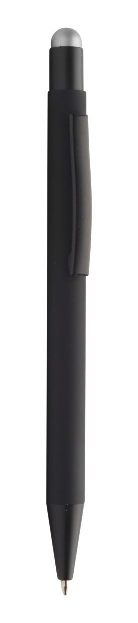 Aluminium-Kugelschreiber mit Touchpen und gummierter Oberfläche und Spezialbeschichtung für eine Farbgravur (Gravurfarbe abgestimmt mit Stylus), blauschreibend.