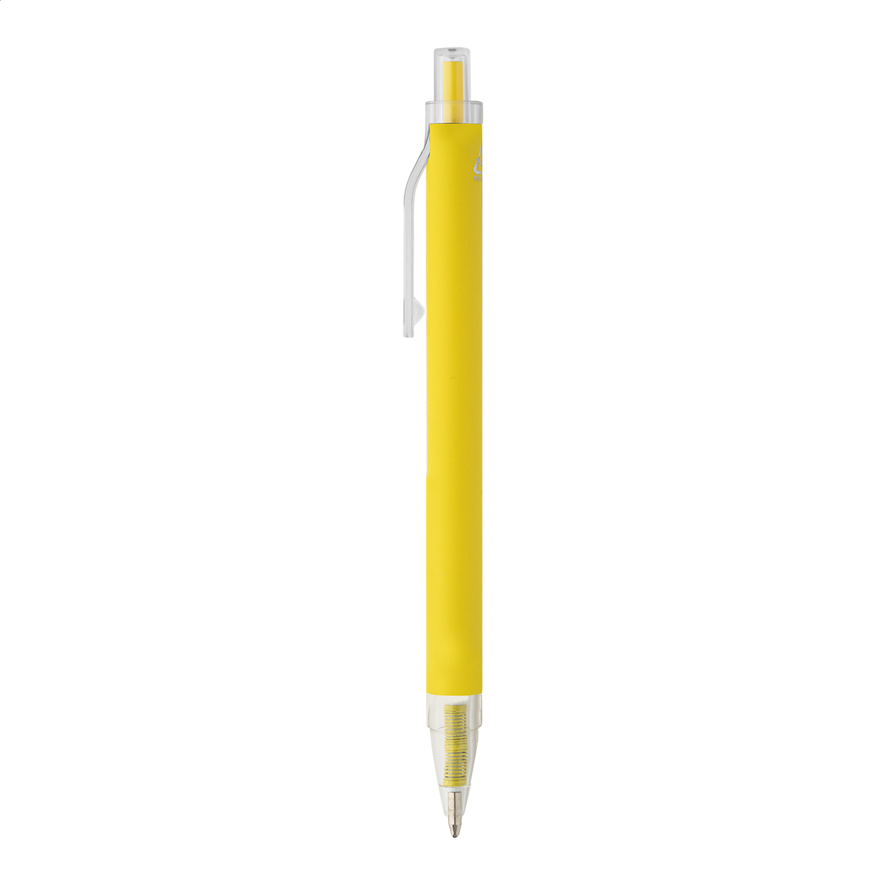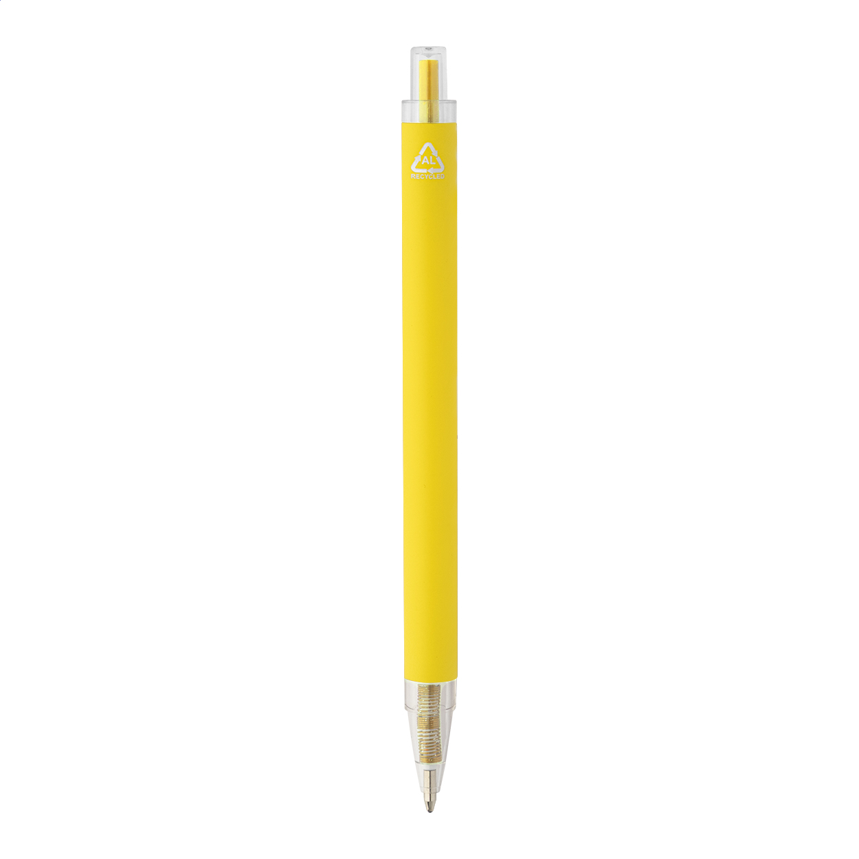 Kugelschreiber aus recyceltem Aluminium mit mattem Schaft und Elementen aus transparentem RPET. Blauschreibend.