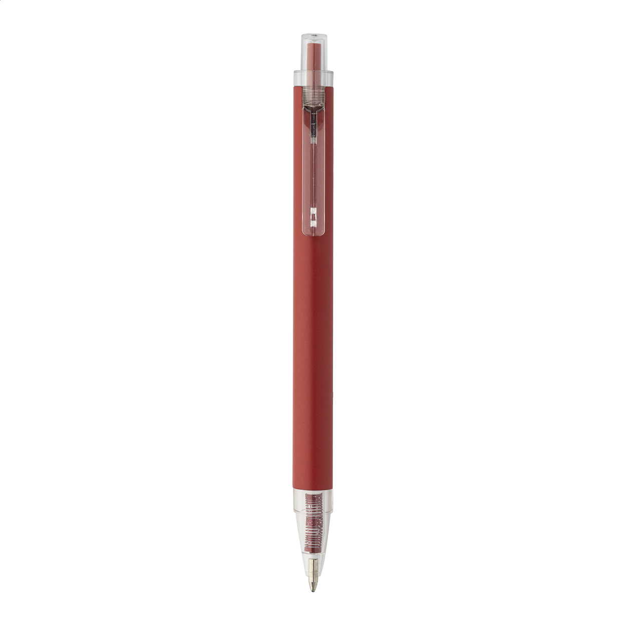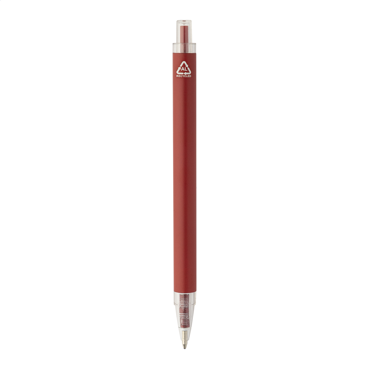 Kugelschreiber aus recyceltem Aluminium mit mattem Schaft und Elementen aus transparentem RPET. Blauschreibend.