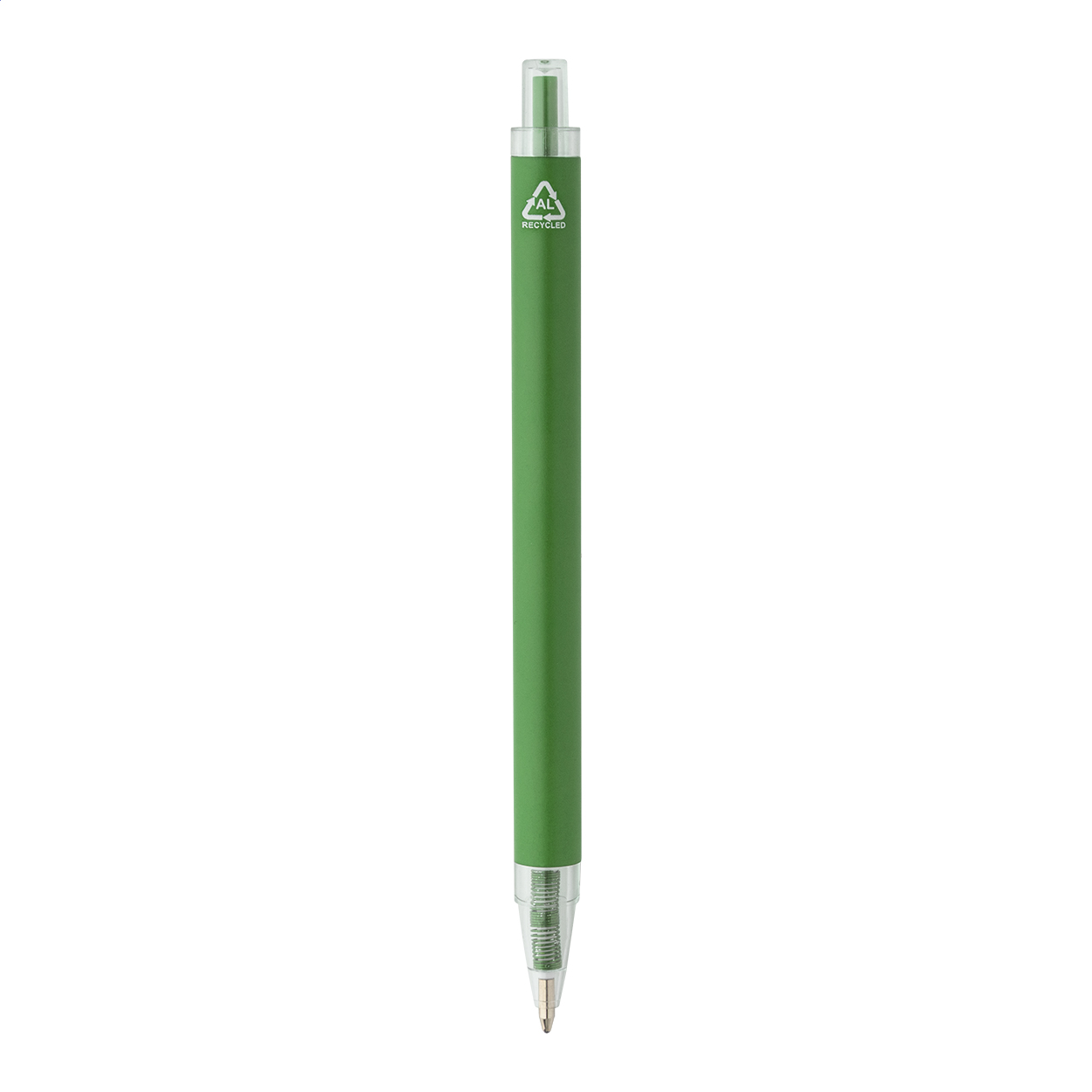Kugelschreiber aus recyceltem Aluminium mit mattem Schaft und Elementen aus transparentem RPET. Blauschreibend.