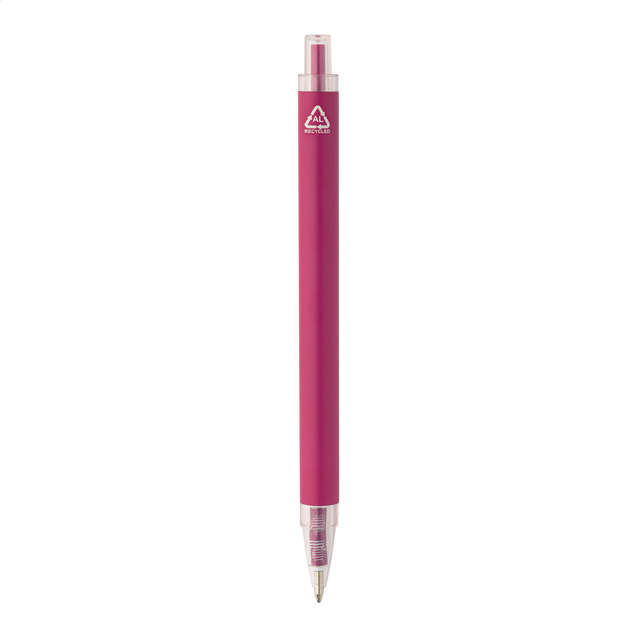 Kugelschreiber aus recyceltem Aluminium mit mattem Schaft und Elementen aus transparentem RPET. Blauschreibend.