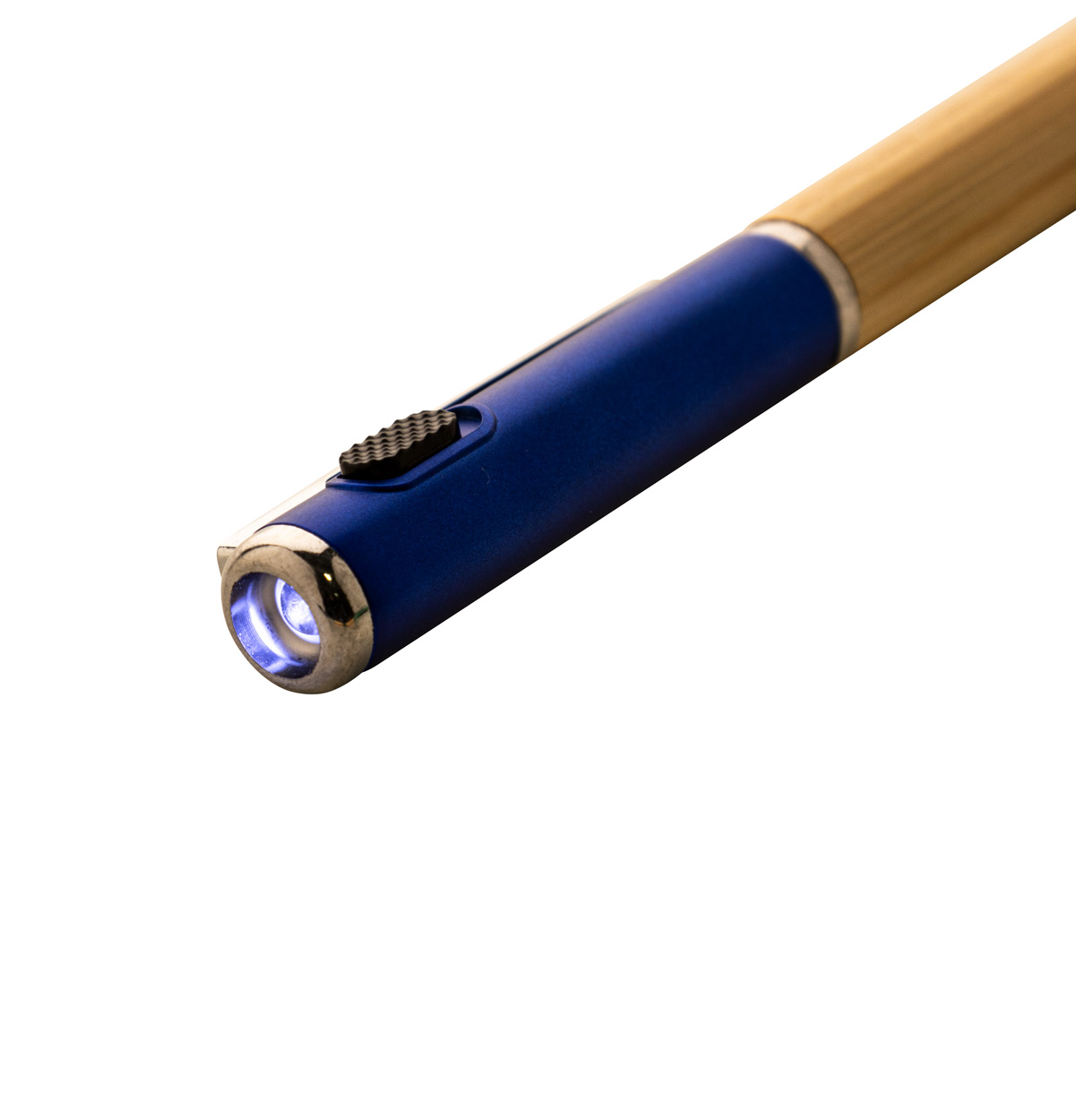 Drehkugelschreiber aus Bambus und recyceltem ABS Kunststoff mit 1 LED Taschenlampe (inkl. Knopfzellenbatterie). Blauschreibend.