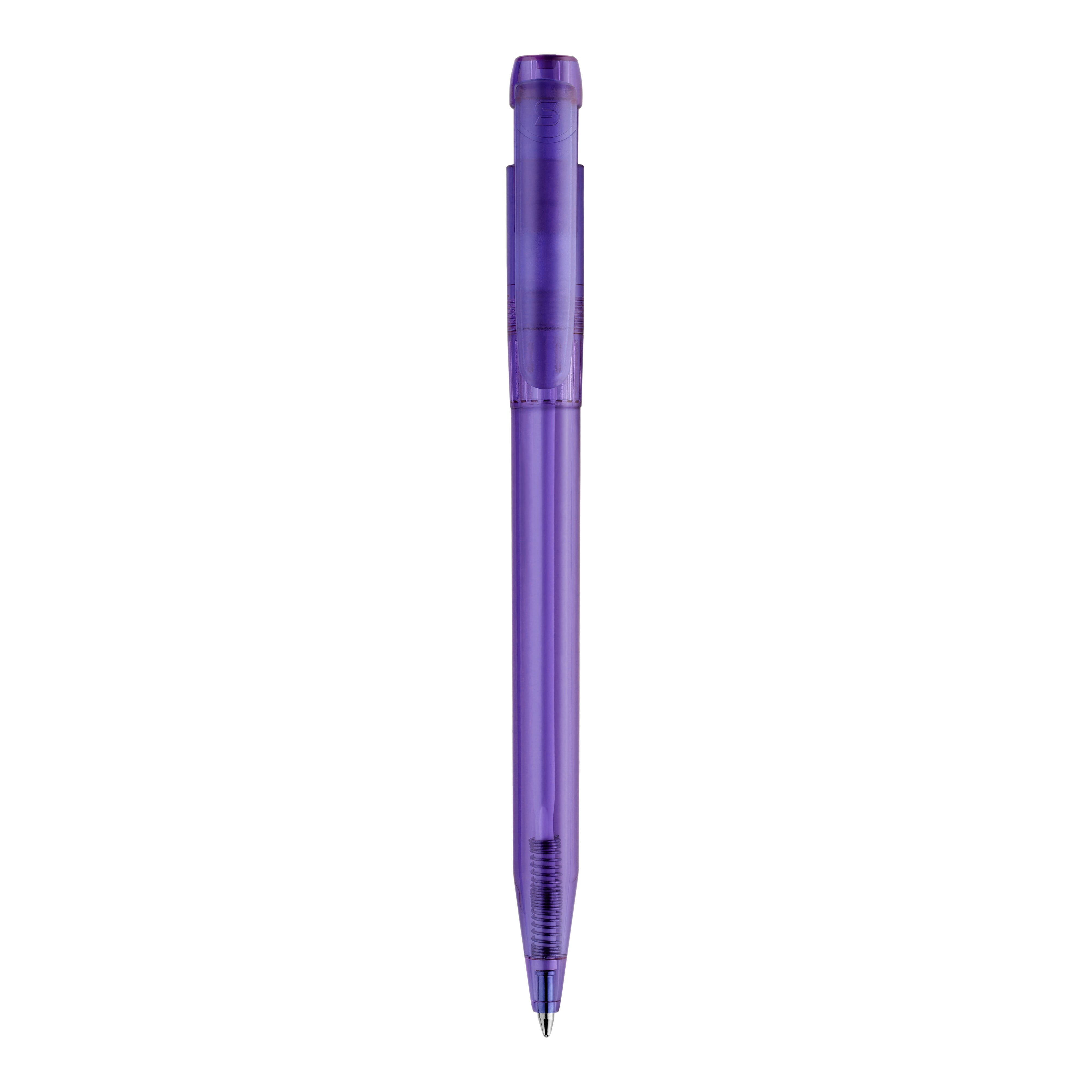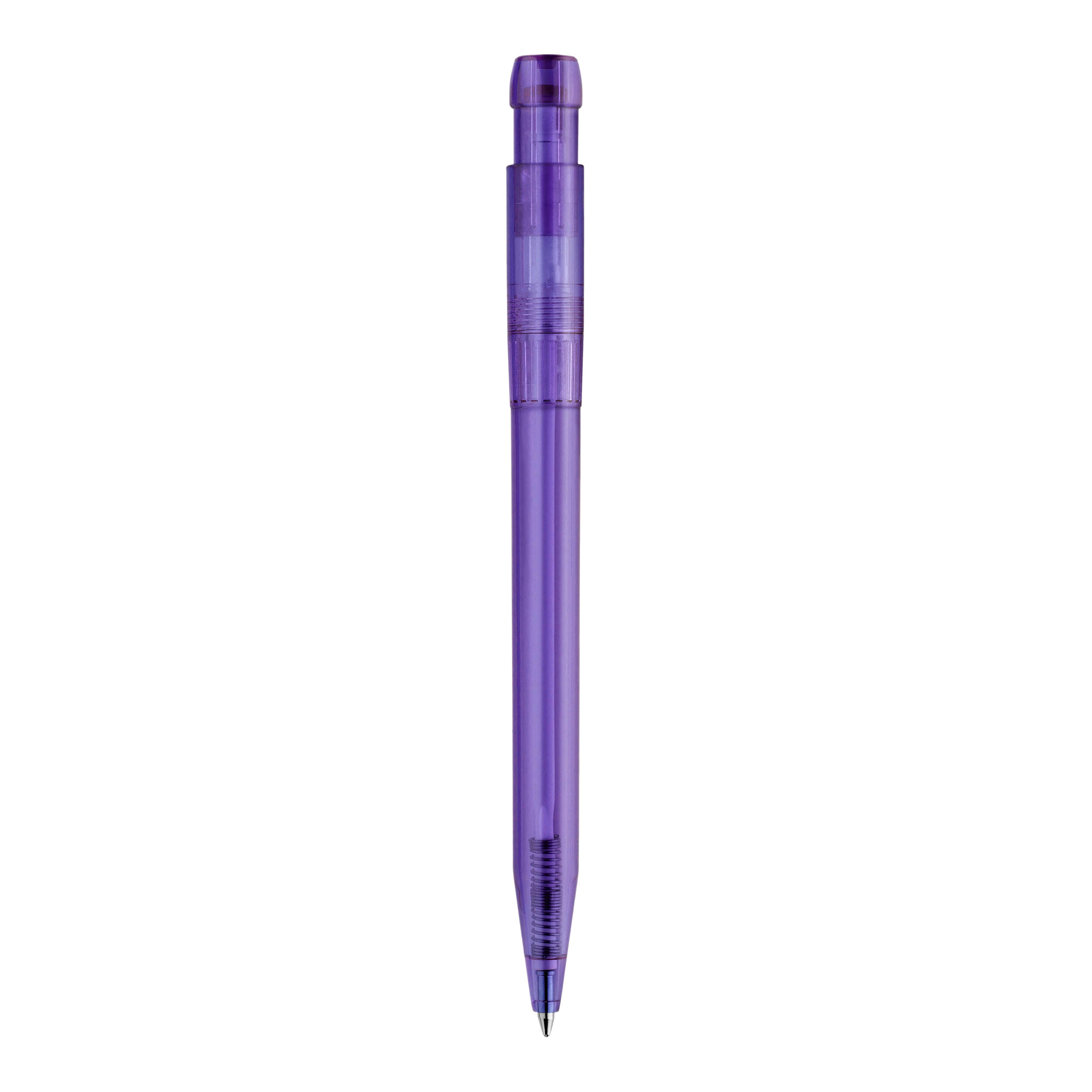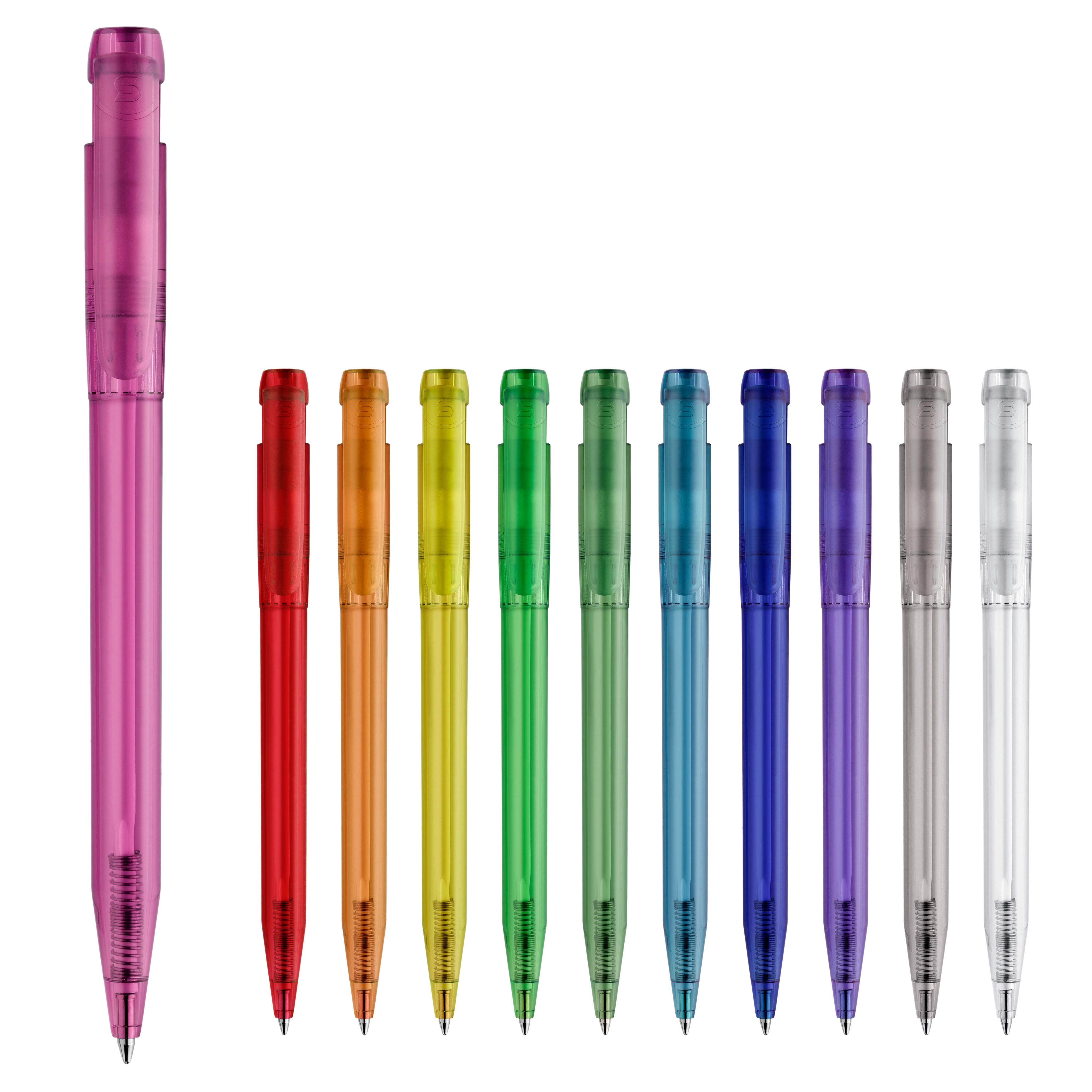 Schlanker transparenter Kugelschreiber in ansprechenden Farben. Ein schöner Werbeartikel wegen seiner Druckfläche. Mit synthetischer blau schreibender X20-Refill-Mine. Druckkugelschreiber aus ABS, hergestellt in Europa. Ab einer Abnahmemenge von 5.000 Stück sind eigene Farbkombinationen möglich.