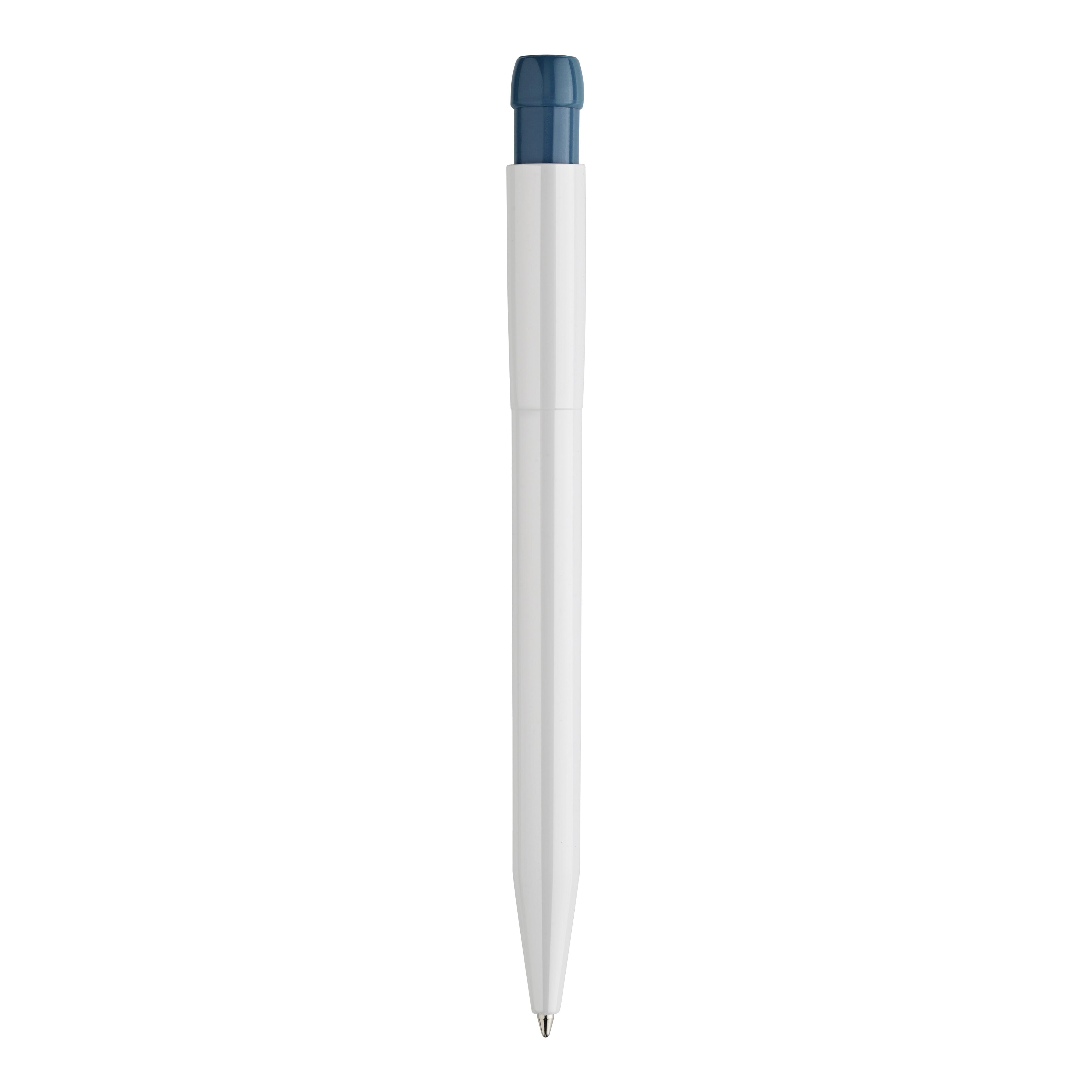 Schlanker weißer Hardcolour-Kugelschreiber mit farbigem Clip. Ein ansprechender Werbeartikel wegen seiner Druckfläche. Mit synthetischer blau schreibender X20-Refill-Mine. Druckkugelschreiber aus ABS, hergestellt in Europa. Ab einer Abnahmemenge von 5.000 Stück sind eigene Farbkombinationen möglich.