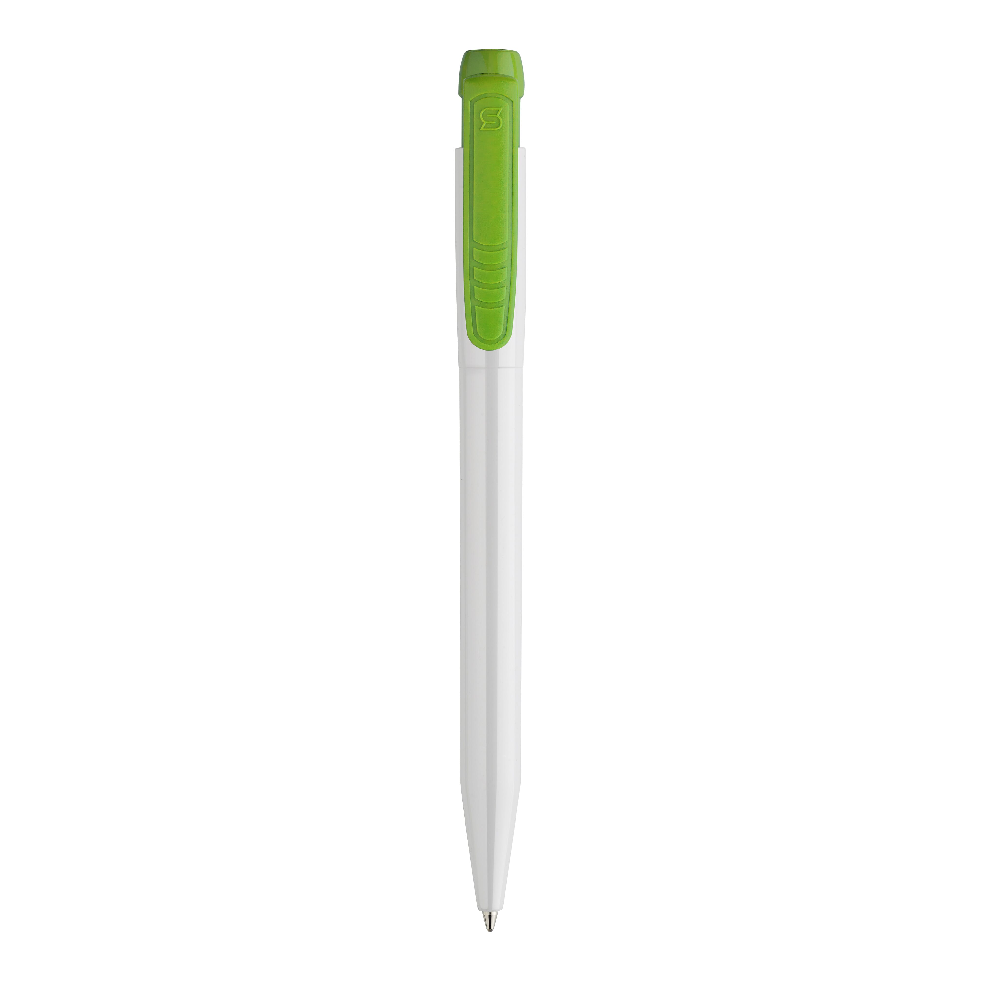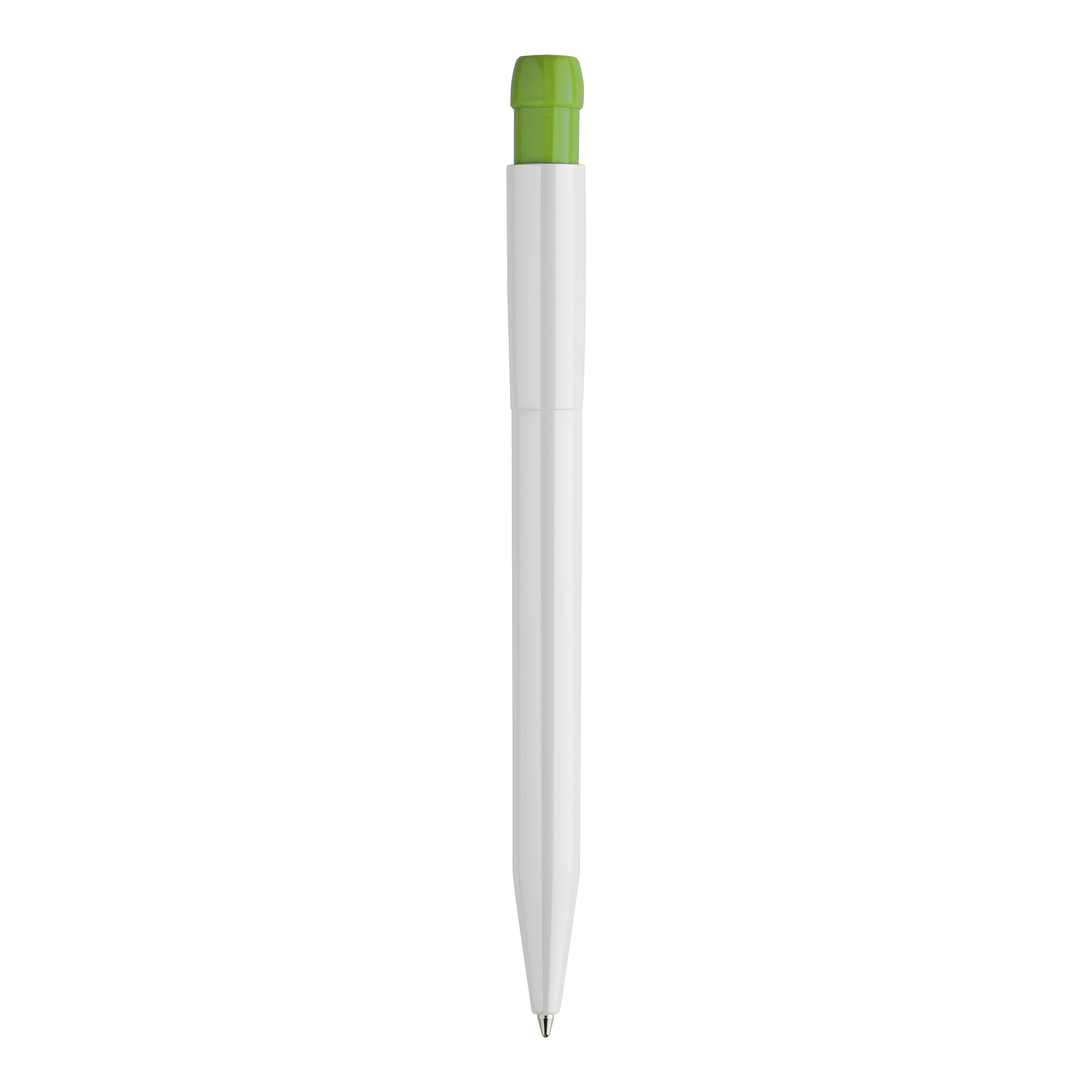 Schlanker weißer Hardcolour-Kugelschreiber mit farbigem Clip. Ein ansprechender Werbeartikel wegen seiner Druckfläche. Mit synthetischer blau schreibender X20-Refill-Mine. Druckkugelschreiber aus ABS, hergestellt in Europa. Ab einer Abnahmemenge von 5.000 Stück sind eigene Farbkombinationen möglich.