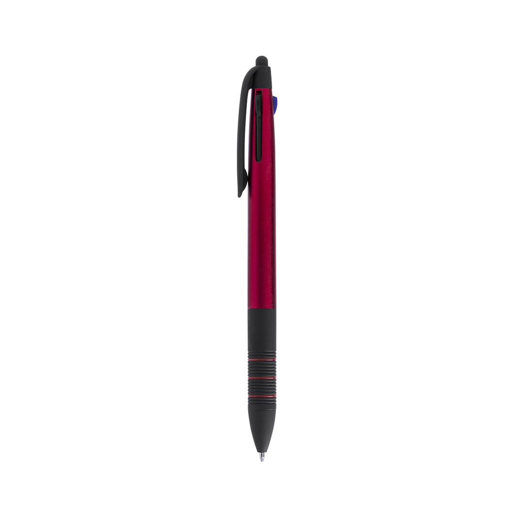 3-in-1 Druck-Kugelschreiber mit Stylus und modernem Design. Geschmeidiger Schaft mit Metallic-Finish in kräftigen Farben und Kontrastdetails sowie ergonomischem Griff in Schwarz. Mit farblich passenden Ringen und 3 Patronen in Blau, Rot und Schwarz.