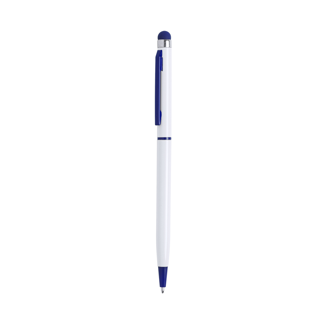 Dreh-Kugelschreiber mit weißem Aluminiumgehäuse und Kontrastdetails in verschiedenen glänzenden Farben. Mit gestanztem Clip und blauer Tinte.