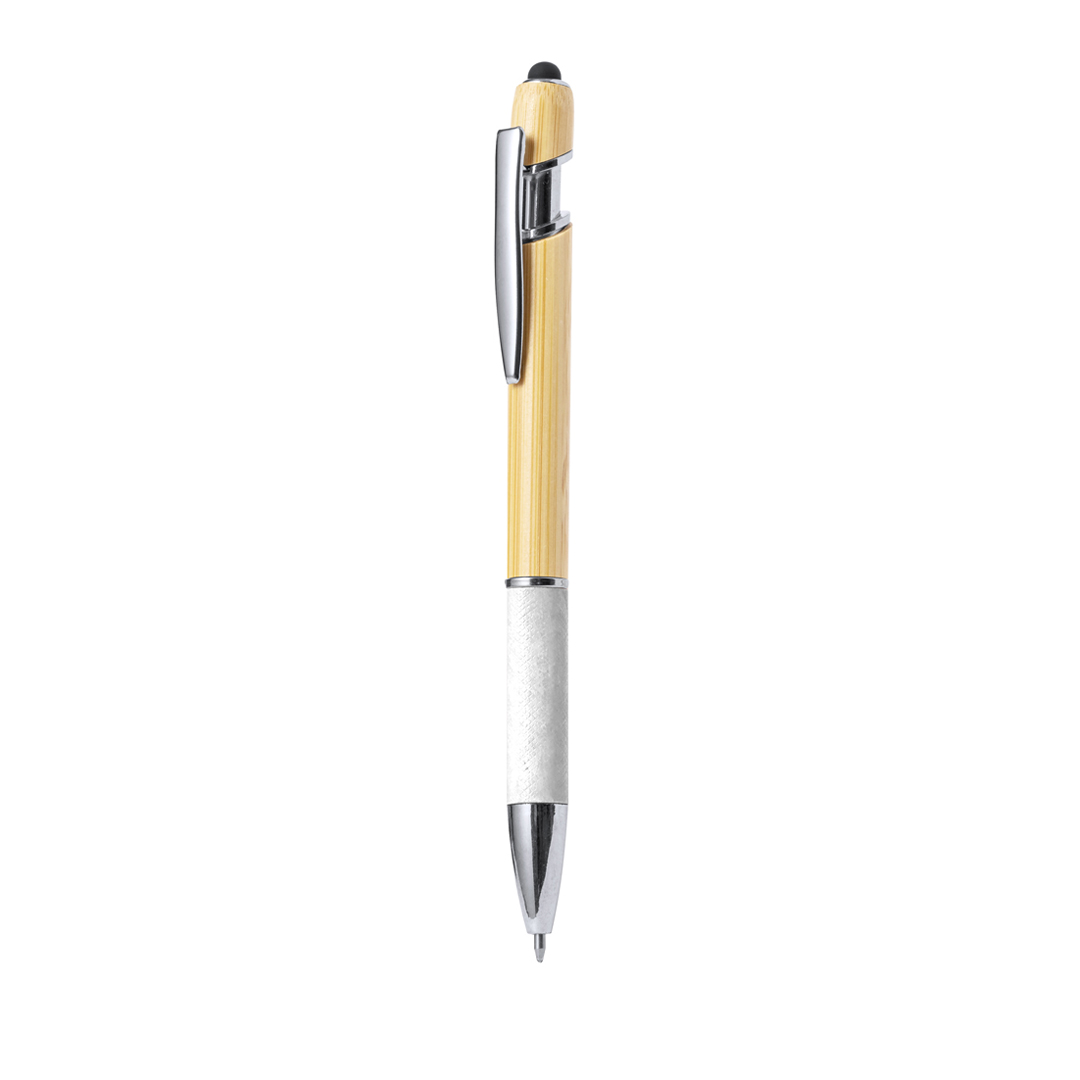 Kugelschreiberzeiger mit Bambusschaft. und Griff aus recyceltem Strukturkarton, in verschiedenen Farben. Oben schwarzer Zeiger, mit Metallclip und verchromten Beschlägen. Druckknopfmechanismus und blaue Tinte. Hergestellt aus pflanzlichen Bestandteilen, um die Verwendung natürlicher Rohstoffe zu fördern und Schadstoffemissionen zu reduzieren.