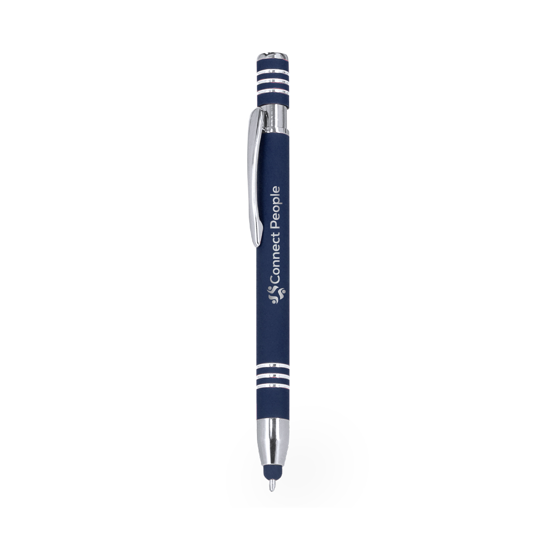 Kugelschreiber mit Druckmechanismus und Stylus, aus Aluminium. Gummierte Oberfläche, speziell für Lasergravur entwickelt, die das Logo in Silberton enthüllt. Verchromte Beschläge und passender Clip inklusive. Blaue Tinte.