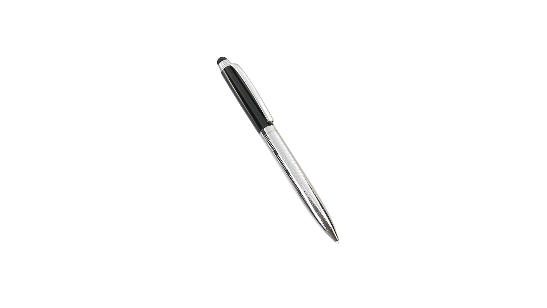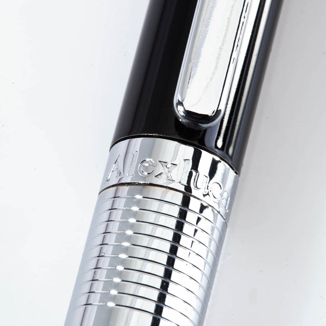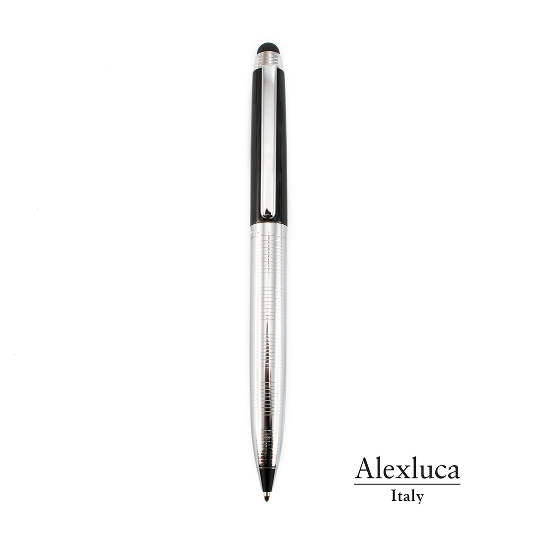 Dreh-Kugelschreiber mit Stylus von Alexluca. Mit angenehm weichem Metallschaft in einer Kombination aus elegantem Schwarz mit Silber. Clip und Griff in passender Farbe. Präsentiert in einem individuellen schwarzem Etui mit Markenlogo. Blaue Tinte.