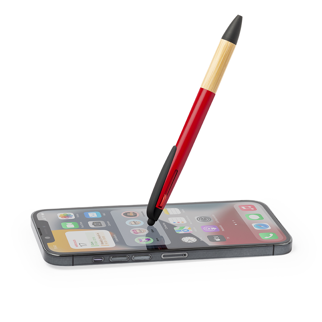 Praktischer Kugelschreiber mit 3 verschiedenen Schreibfarben (blau, rot und schwarz) aus Bambus. Druckknopfmechanismus, mit weichem Bambusgriff. Clip und Spitze in elegantem Schwarz und Schaft in verschiedenen leuchtenden Farben, mit Zeiger oben. Materialien wie Bambus fördern die Nutzung natürlicher Rohstoffe und reduzieren so den Schadstoffausstoß. Es stammt von einer äußerst widerstandsfähigen und vielseitigen Pflanze mit schnellem Wachstum und Regeneration, was es zu einer hervorragenden Alternative zur Verwendung von herkömmlichem Holz macht.