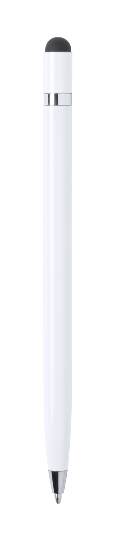Dreh-Kugelschreiber mit Stylus aus Aluminium mit geschmeidigem Metallic-Finish und verchromtem Ring. Erhältlich in Gold, Rosa und Silber in glänzender Ausführung sowie Weiß in matter Ausführung. Blaue Tinte.