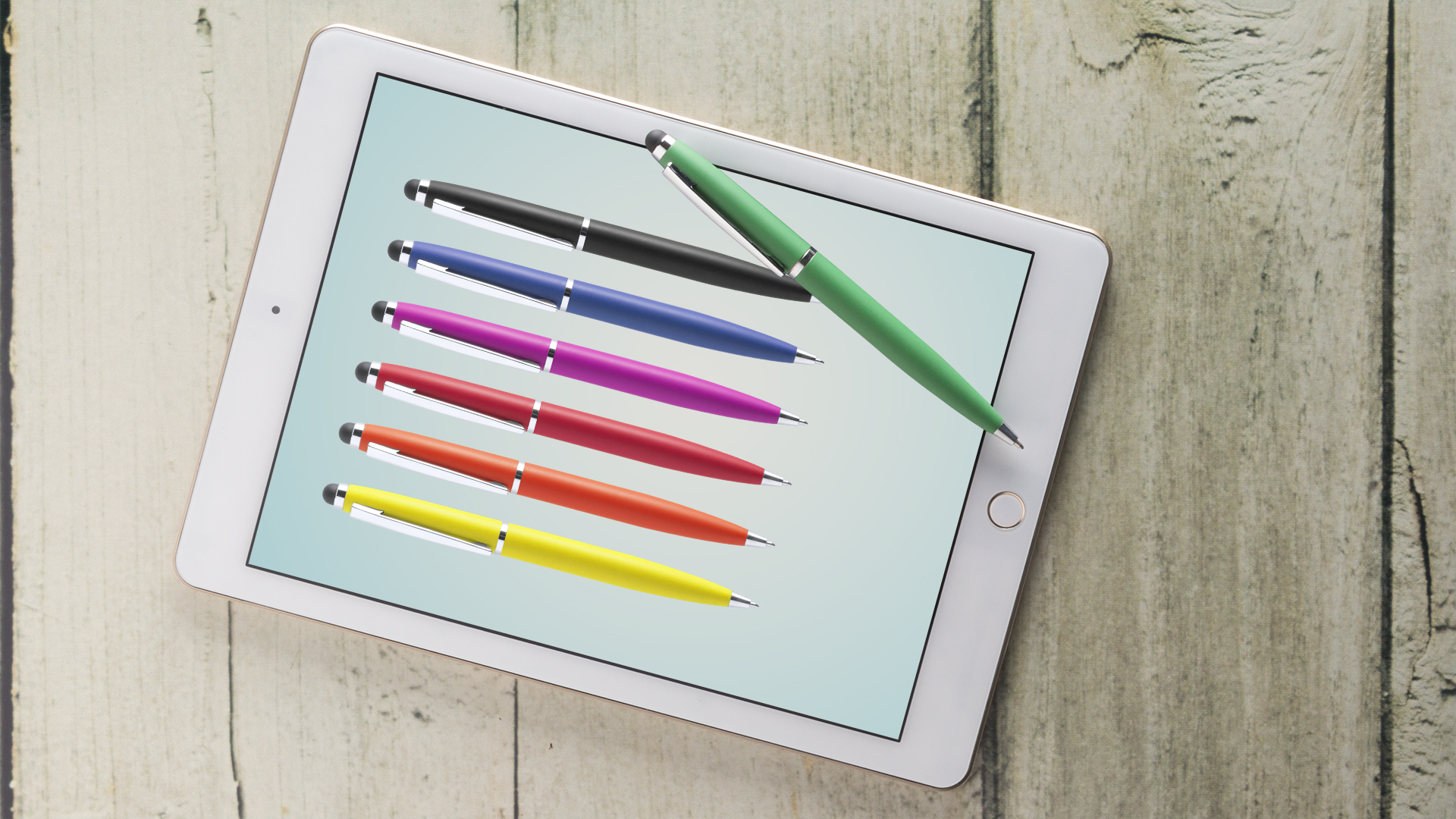 Dreh-Kugelschreiber mit Stylus und Metallgehäuse in kräftigen Farben. Kontrastdetails und Ringe in Silber. Blaue Tinte.