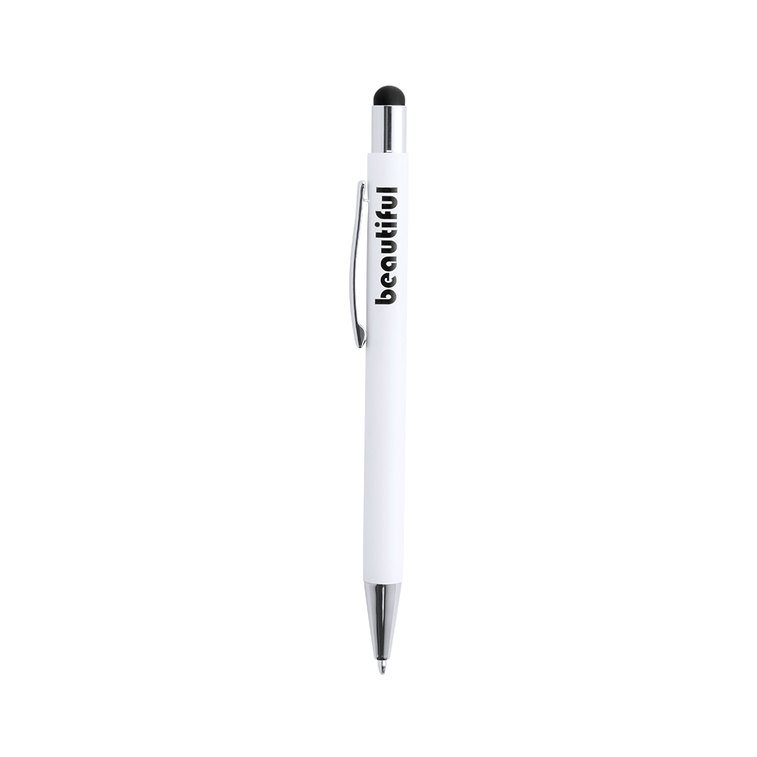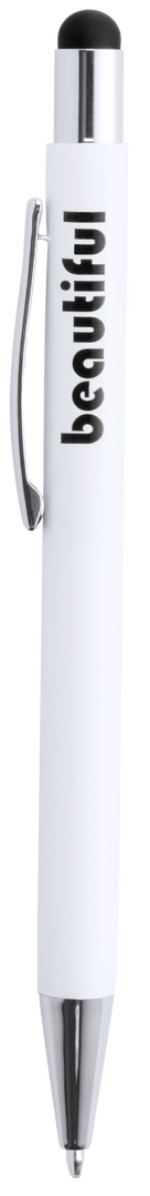 Druck-Kugelschreiber mit Stylus aus Aluminium in einem eleganten, matten Weiß. Mit Stylus in einer Vielzahl von Farben - farblich passend zum Interieur - und verchromten Kontrastdetails. Mit Außenbeschichtung, die speziell für die Lasermarkierung entwickelt wurde, so dass Ihr Logo in der Farbe des Interieurs graviert wird. Jumbo-Patrone mit blauer Tinte.