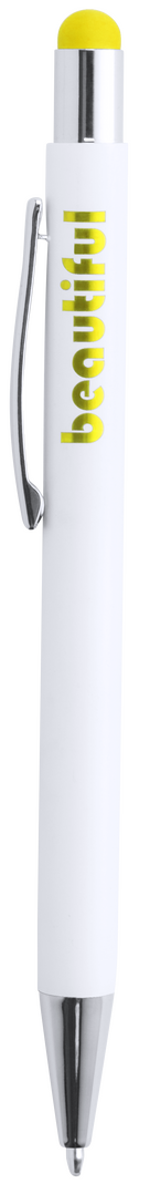 Druck-Kugelschreiber mit Stylus aus Aluminium in einem eleganten, matten Weiß. Mit Stylus in einer Vielzahl von Farben - farblich passend zum Interieur - und verchromten Kontrastdetails. Mit Außenbeschichtung, die speziell für die Lasermarkierung entwickelt wurde, so dass Ihr Logo in der Farbe des Interieurs graviert wird. Jumbo-Patrone mit blauer Tinte.