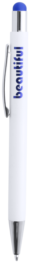 Druck-Kugelschreiber mit Stylus aus Aluminium in einem eleganten, matten Weiß. Mit Stylus in einer Vielzahl von Farben - farblich passend zum Interieur - und verchromten Kontrastdetails. Mit Außenbeschichtung, die speziell für die Lasermarkierung entwickelt wurde, so dass Ihr Logo in der Farbe des Interieurs graviert wird. Jumbo-Patrone mit blauer Tinte.