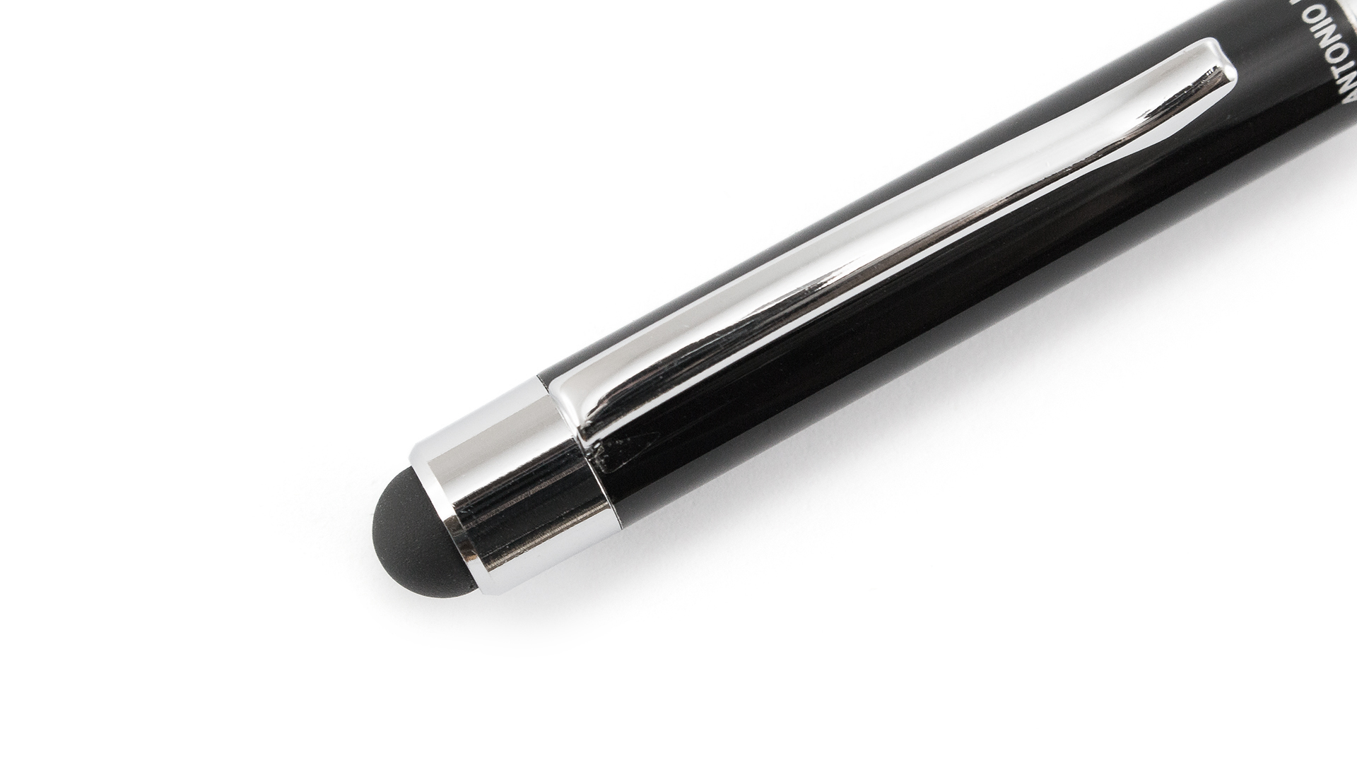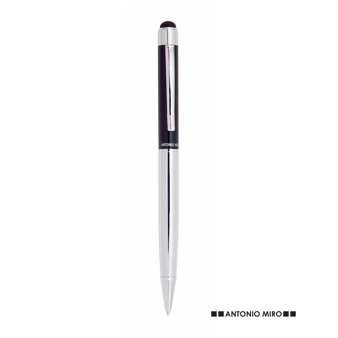 Dreh-Kugelschreiber von Antonio Miró mit geschmeidigem Metallschaft in einer eleganten Schwarz / Silber-Kombination. Mit Clip und Spitze in passender Farbe. Präsentiert in einer individuellen schwarzen Schachtel mit dem Markenlogo. Blaue Tinte.