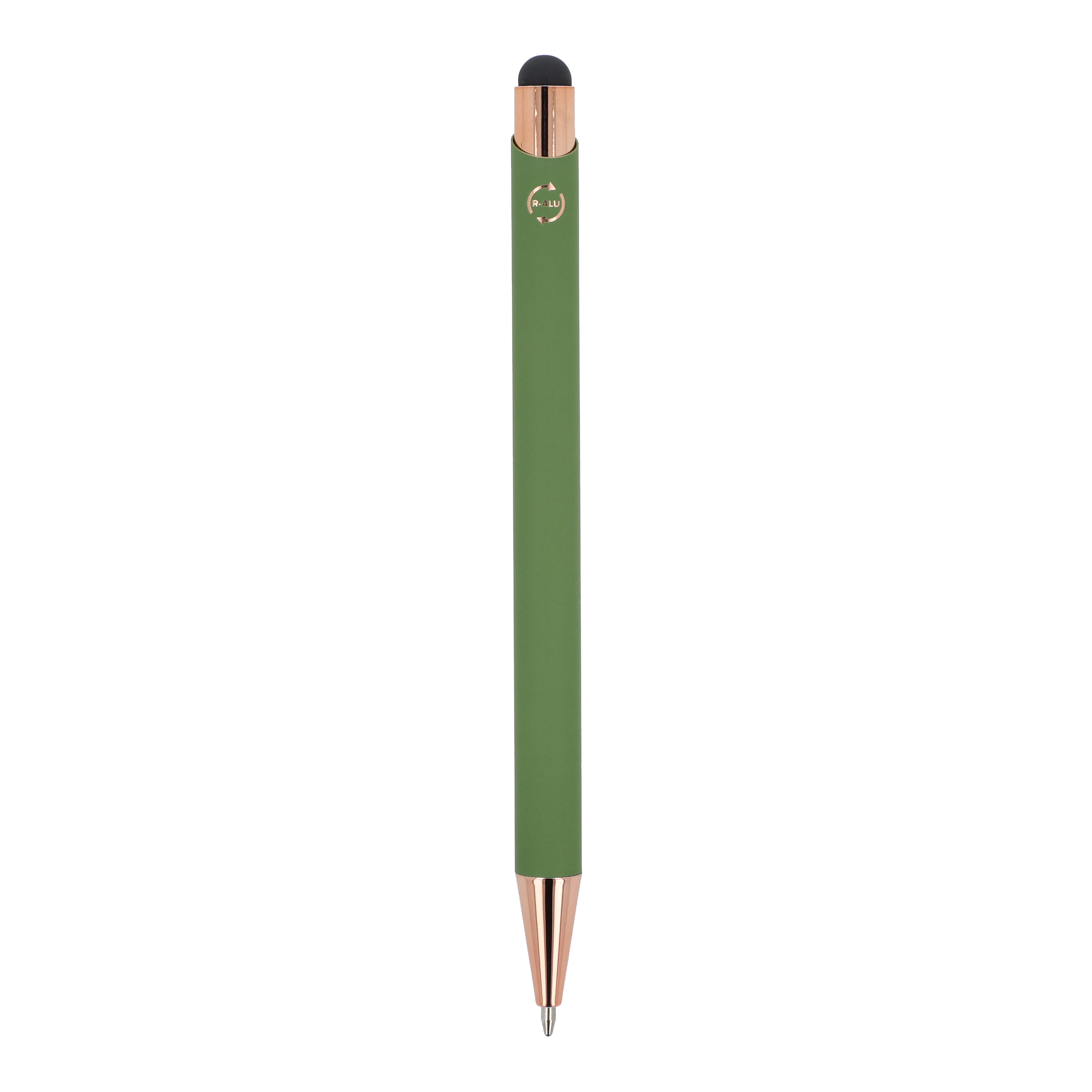 Stilvoller Kugelschreiber aus recyceltem Aluminium mit Metallclip. Die Farbe Rosa findet sich sowohl in den Akzenten des Kugelschreibers als auch in der Farbe der Lasergravur wieder. Der Kugelschreiber wird mit einer blauen Jumbo-Mine geliefert.