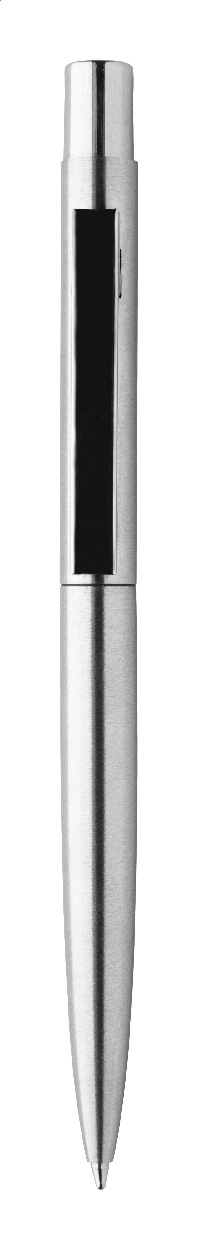Kugelschreiber aus recyceltem Edelstahl mit Chromdetails, blauschreibend.