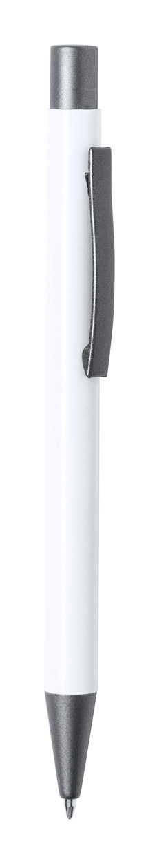 Kugelschreiber aus recyceltem Aluminium mit Gunmetal-Elementen, blauschreibend.