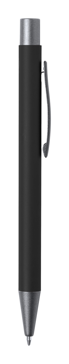 Kugelschreiber aus recyceltem Aluminium mit Gunmetal-Elementen, blauschreibend.