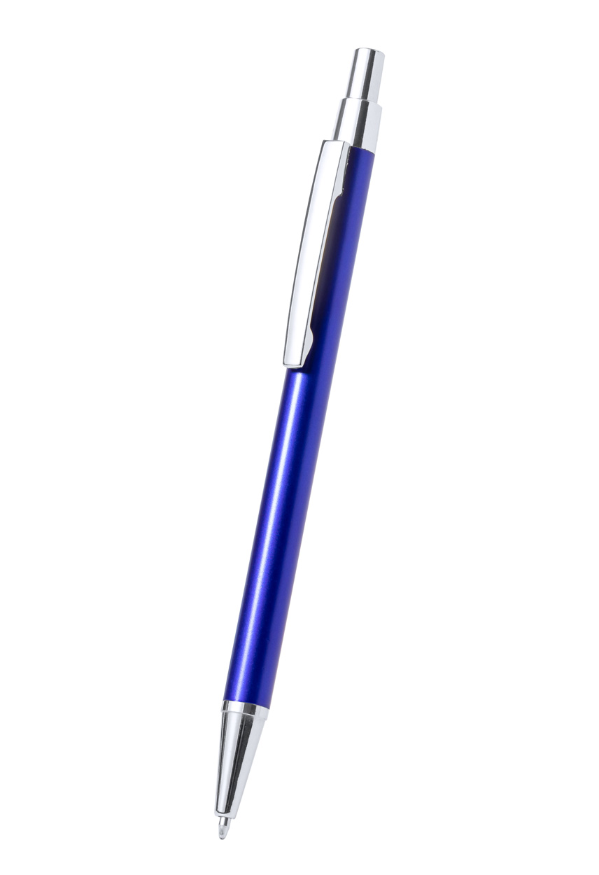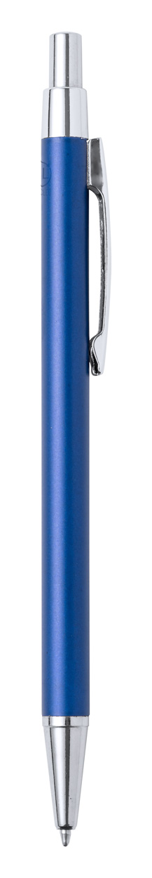 Kugelschreiber aus recyceltem Aluminium mit Chromteilen, blauschreibend.