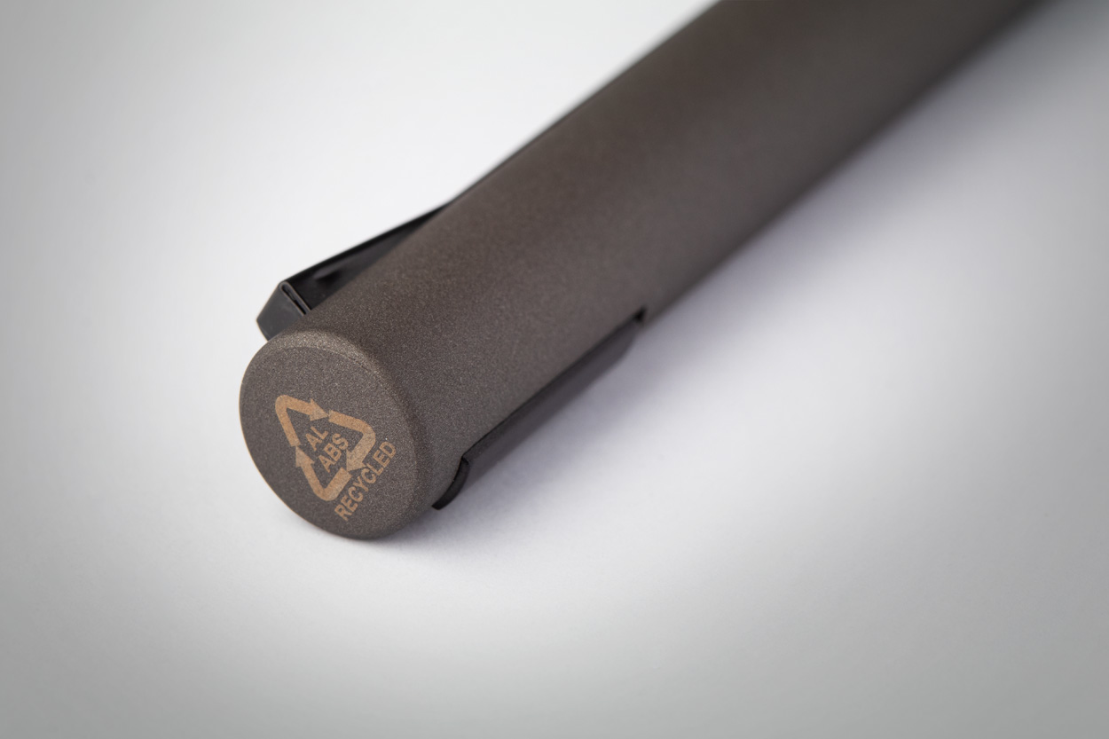 Kugelschreiber aus recyceltem Aluminium in mattem Metallic-Farbton, mit recyceltem ABS-Oberteil und spezieller Clipmechanik, blauschreibend.