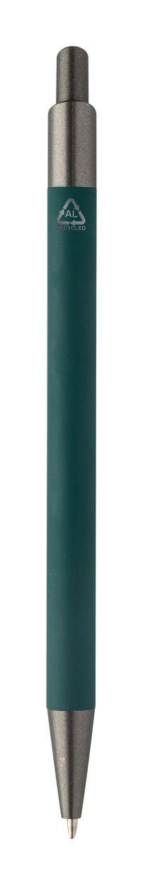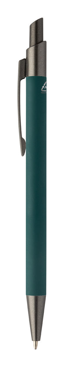 Kugelschreiber aus recyceltem Aluminium mit gummierter Oberfläche und Elementen in Gunmetal-Optik. Blauschreibend.