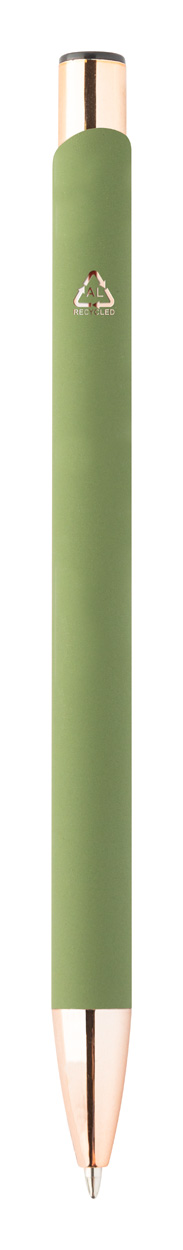 Kugelschreiber mit Touchpen aus recyceltem Aluminium, mit gummierter Oberfläche und roségoldenen Elementen. Mit Spezialbeschichtung für Spiegelgravur in Roségold, blauschreibend.