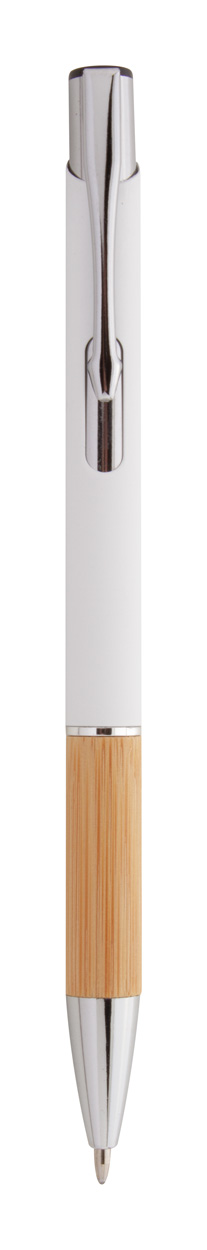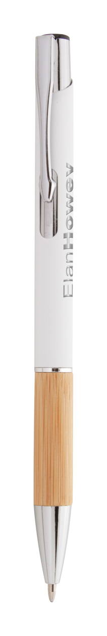 Aluminium-Kugelschreiber mit Bambus-Griffzone, gummierter Oberfläche und spezieller Beschichtung für eine Spiegelgravur, blauschreibend.
