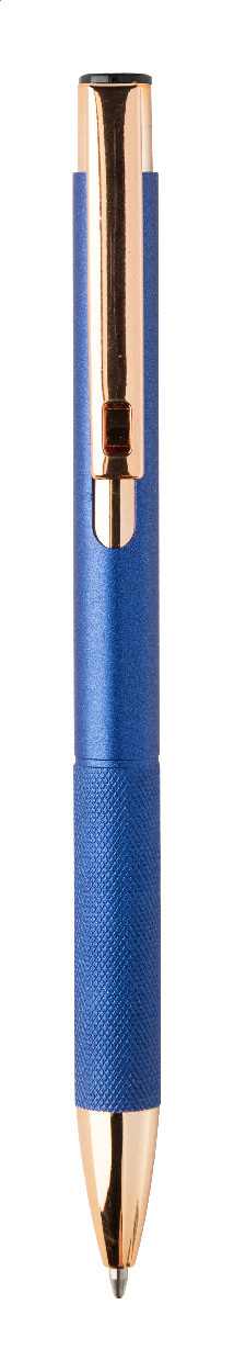 Kugelschreiber aus recyceltem Aluminium mit mattiertem Gehäuse, strukturiertem Griffstück und Roségold-Details, blauschreibend. Mit Spezialbeschichtung für Spiegelgravur in Roségold.