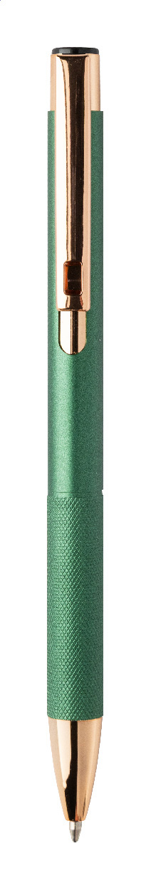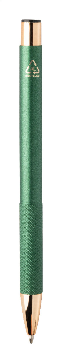 Kugelschreiber aus recyceltem Aluminium mit mattiertem Gehäuse, strukturiertem Griffstück und Roségold-Details, blauschreibend. Mit Spezialbeschichtung für Spiegelgravur in Roségold.