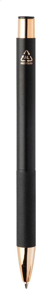 Kugelschreiber aus recyceltem Aluminium mit mattiertem Gehäuse, strukturiertem Griffstück und Roségold-Details, blauschreibend. Mit Spezialbeschichtung für Spiegelgravur in Roségold.