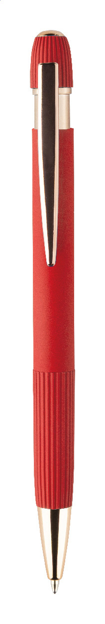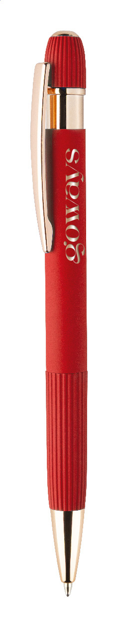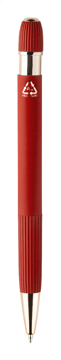 Kugelschreiber aus recyceltem Aluminium mit gummiertem Gehäuse und roségoldenen Details, blauschreibend. Mit Spezialbeschichtung für Spiegelgravur in Roségold.