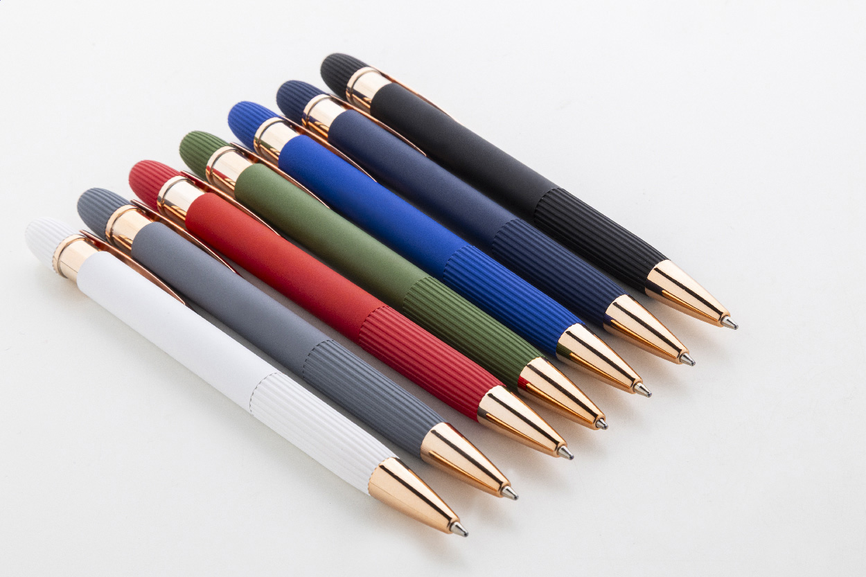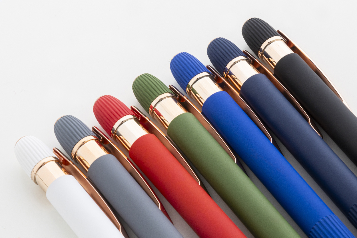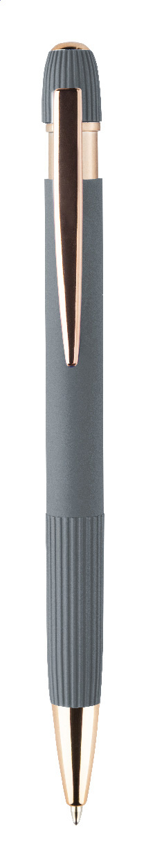 Kugelschreiber aus recyceltem Aluminium mit gummiertem Gehäuse und roségoldenen Details, blauschreibend. Mit Spezialbeschichtung für Spiegelgravur in Roségold.