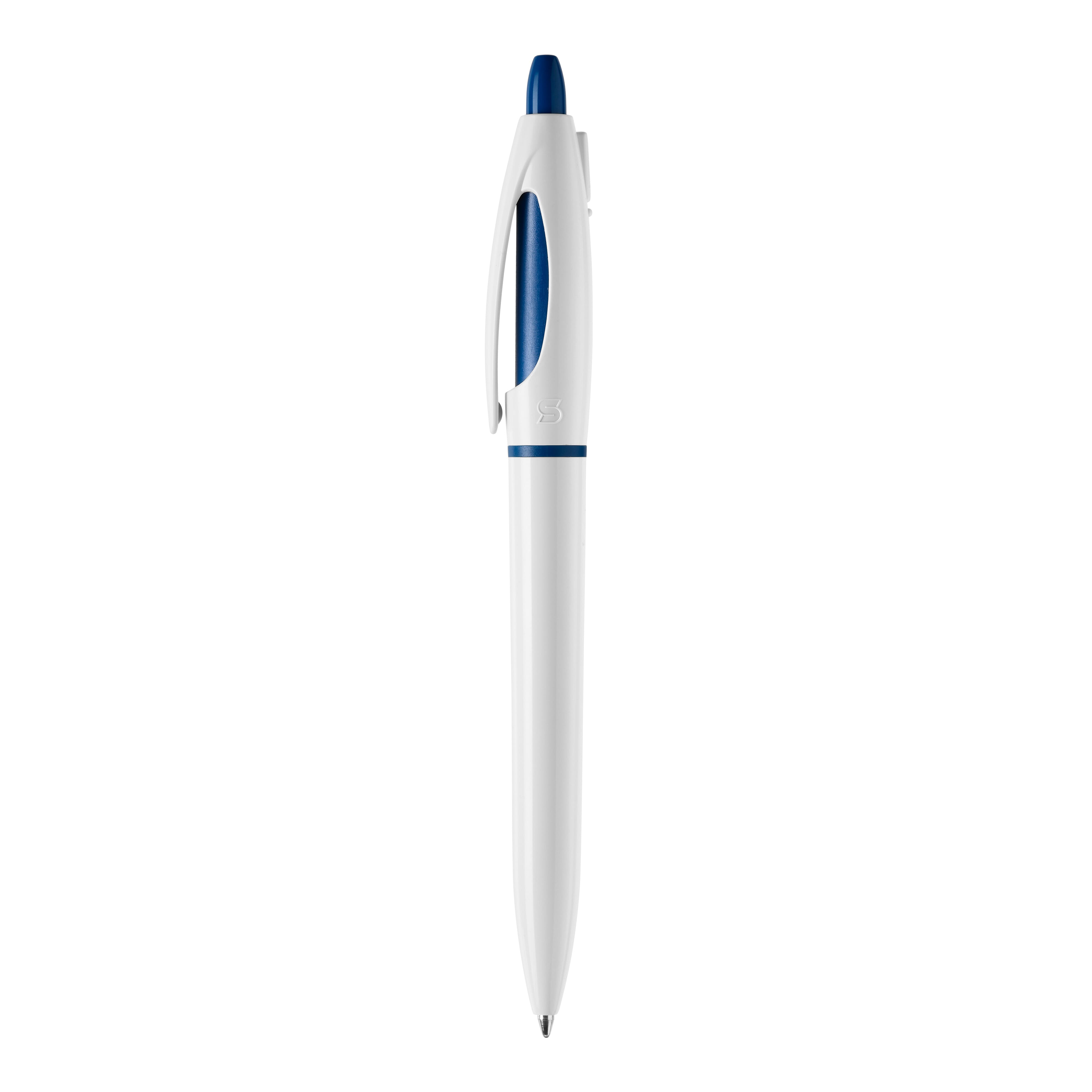 Der Hardcolour Kugelschreiber S! mit weißem Schaft und weißen Clip. Der Drücker und der Ring sind farbig. Ausgestattet mit einer blau schreibenden X20-Refill-Mine. Der Kugelschreiber besteht aus ABS und wird in Europa hergestellt. Ab einer Abnahmemenge von 5.000 Stück sind eigene Farbkombinationen möglich.