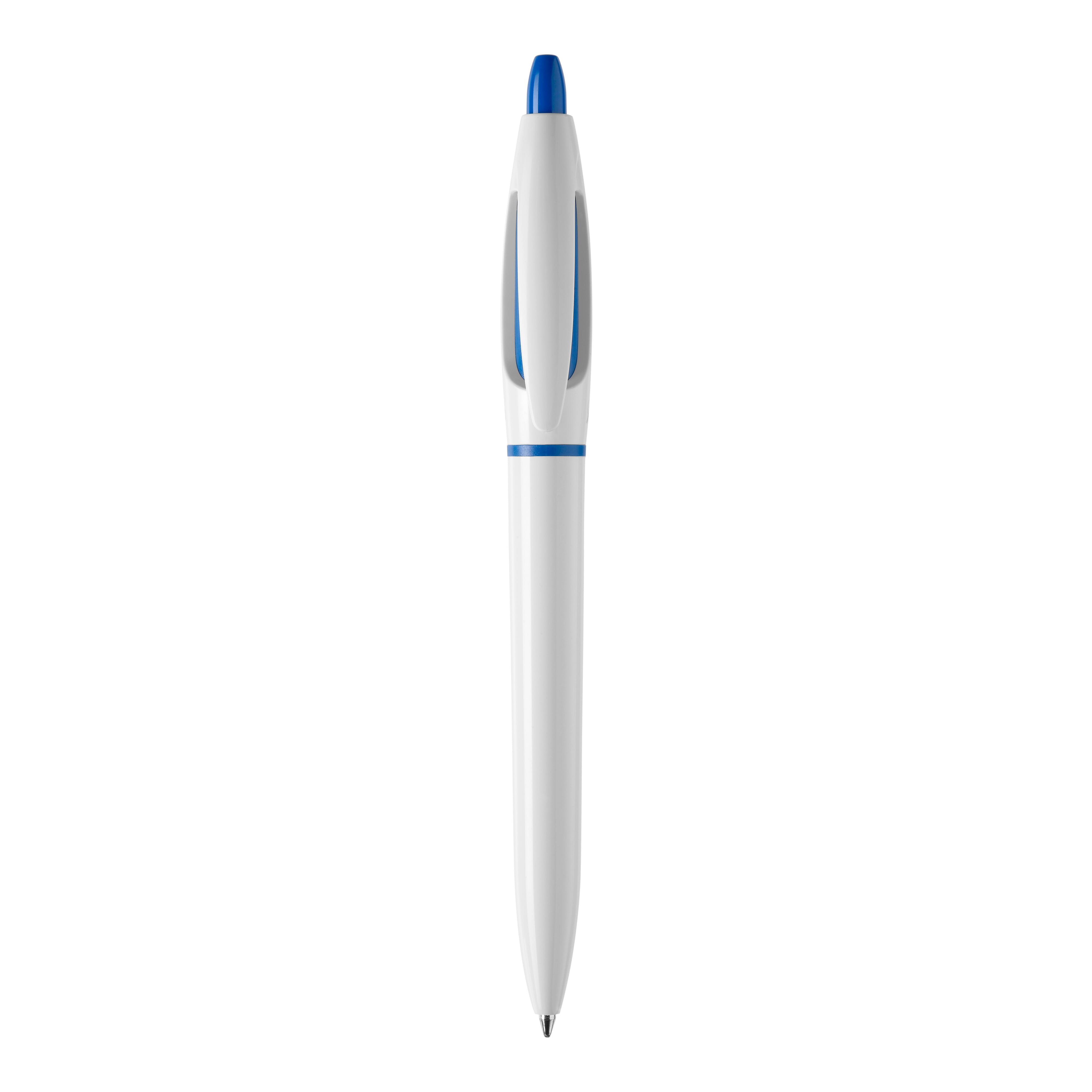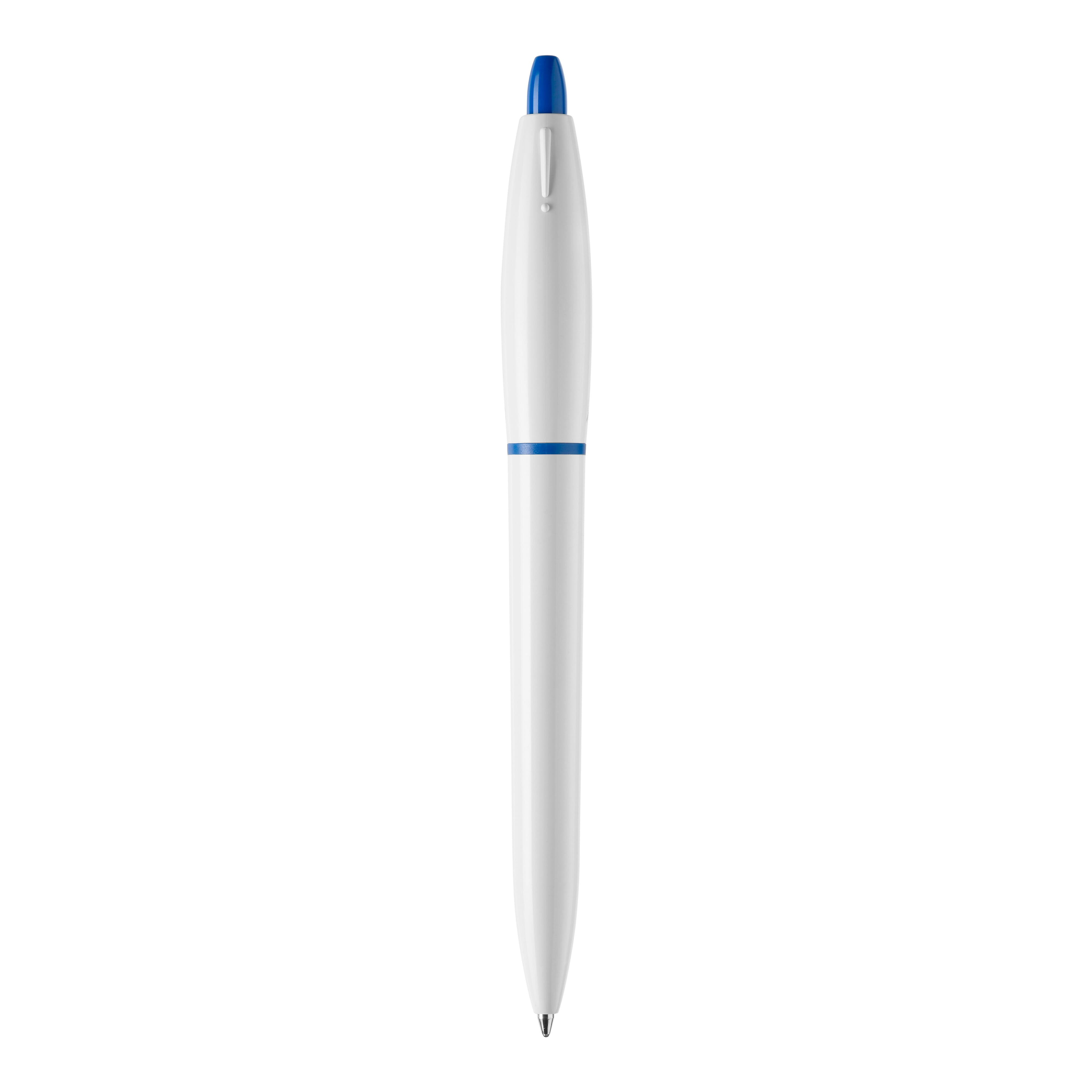 Der Hardcolour Kugelschreiber S! mit weißem Schaft und weißen Clip. Der Drücker und der Ring sind farbig. Ausgestattet mit einer blau schreibenden X20-Refill-Mine. Der Kugelschreiber besteht aus ABS und wird in Europa hergestellt. Ab einer Abnahmemenge von 5.000 Stück sind eigene Farbkombinationen möglich.