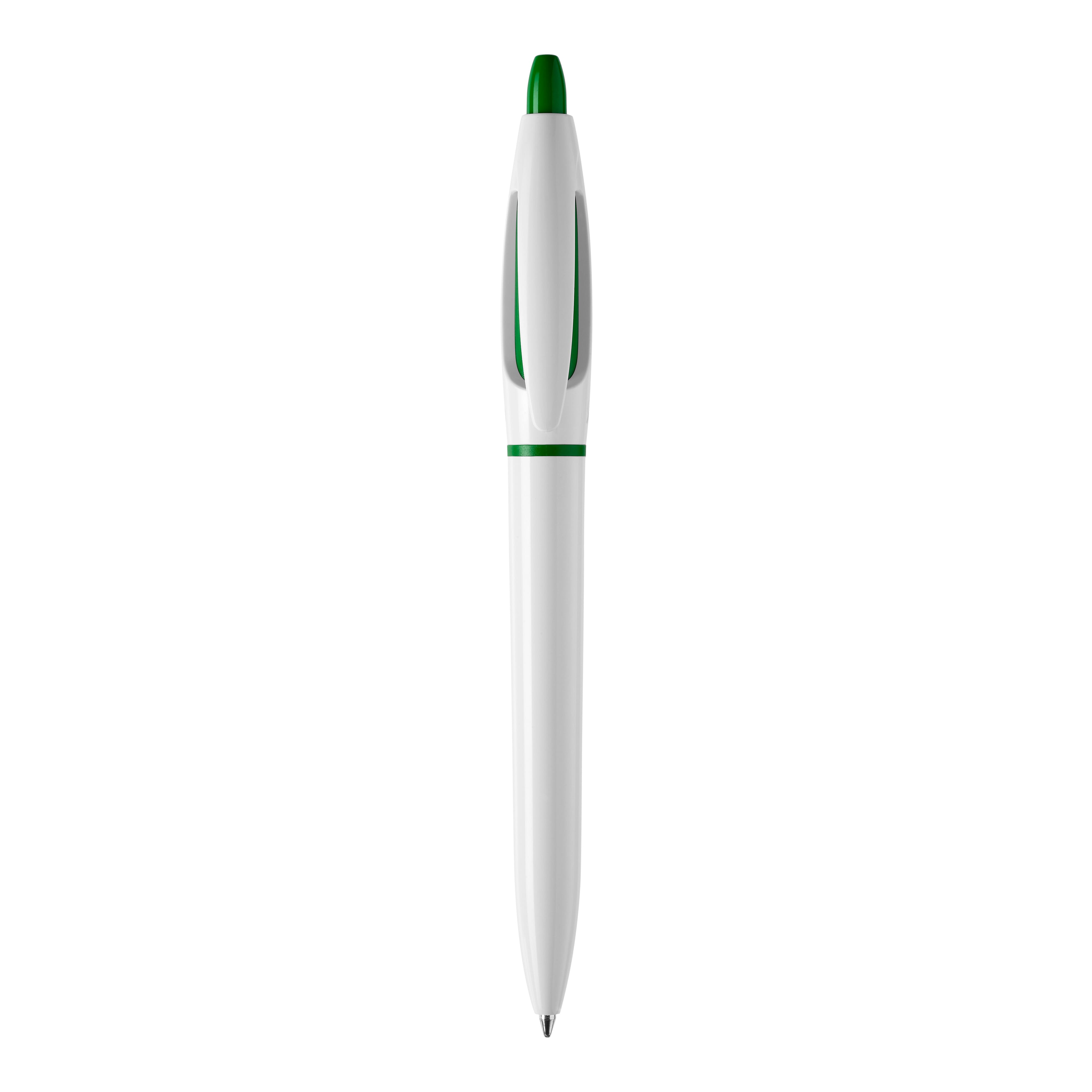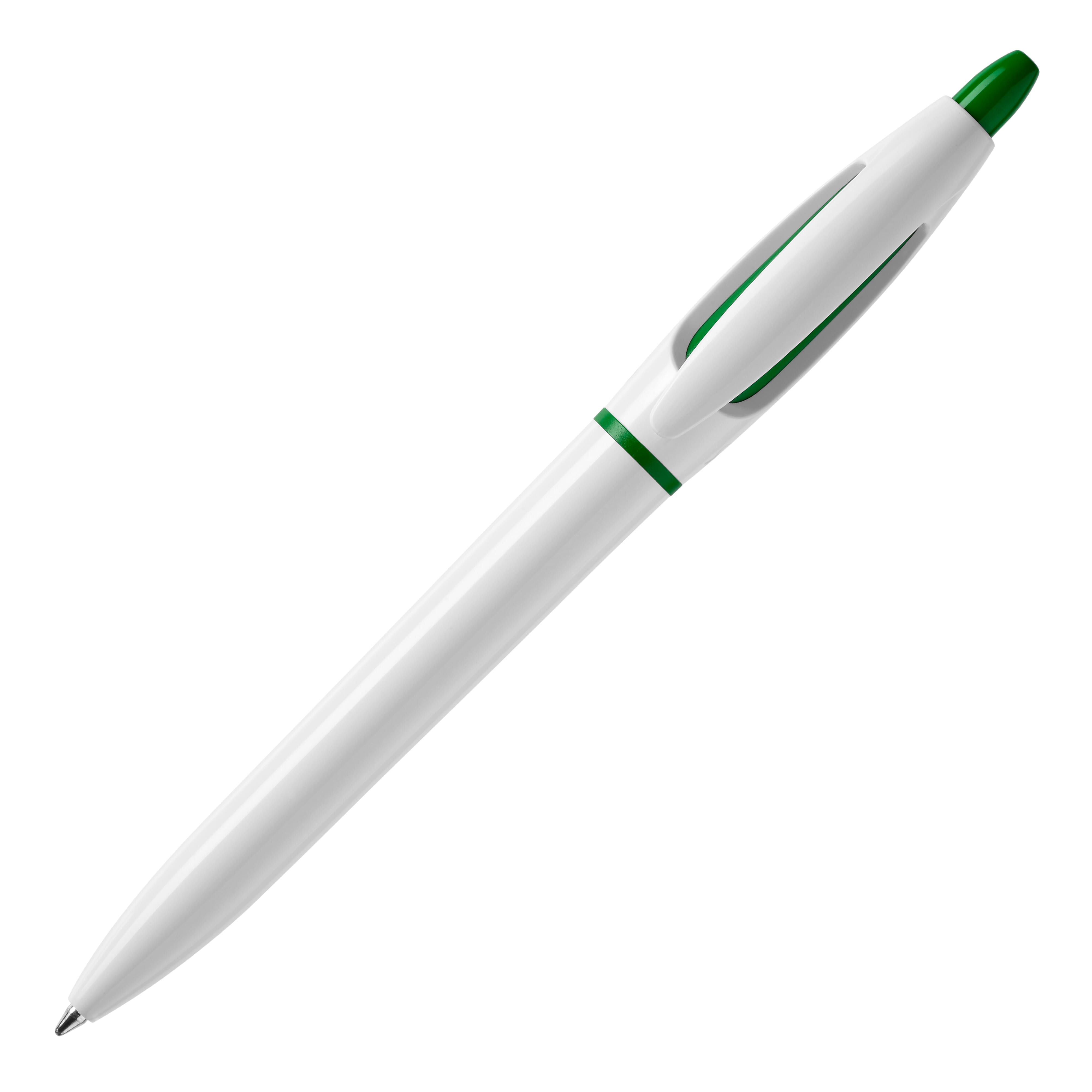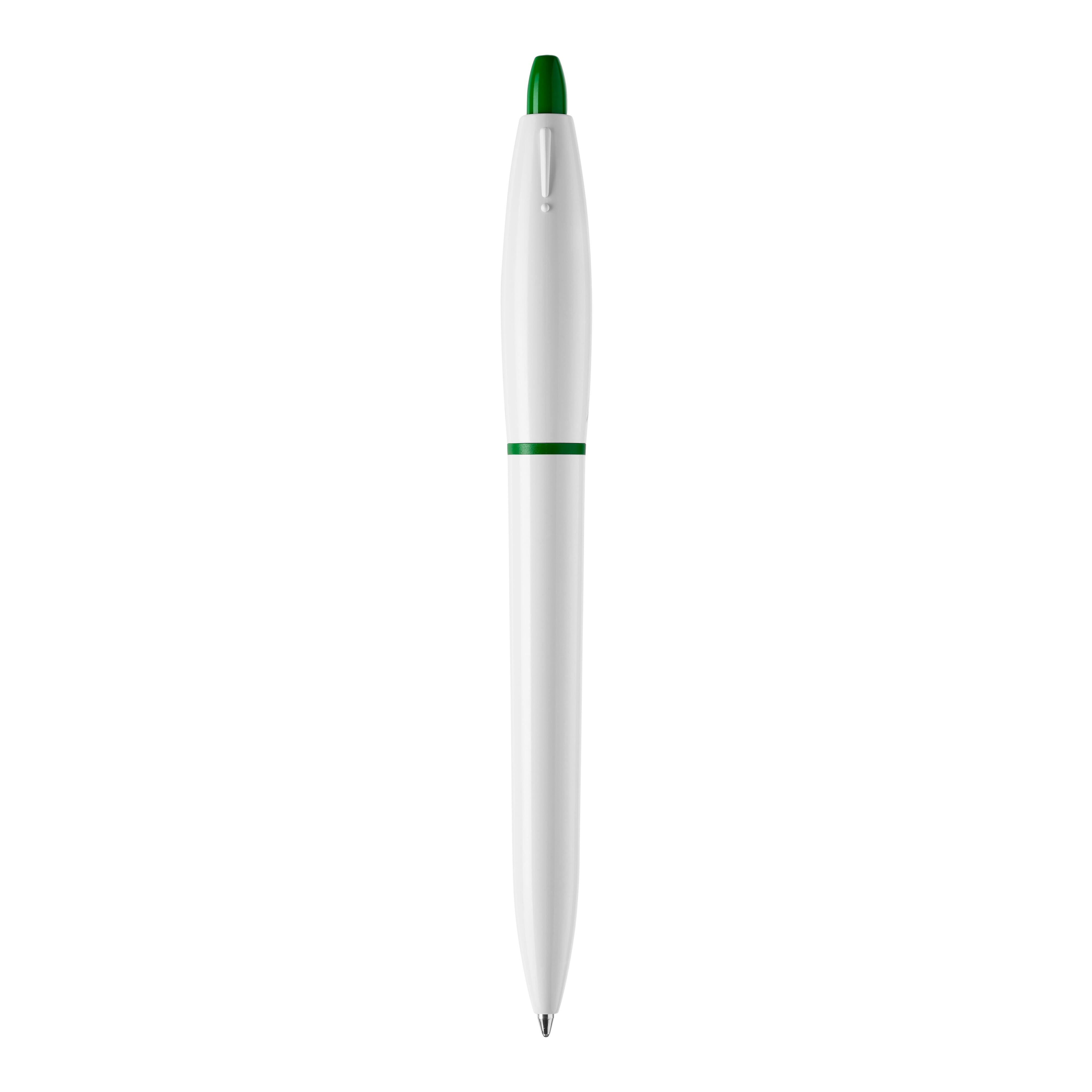 Der Hardcolour Kugelschreiber S! mit weißem Schaft und weißen Clip. Der Drücker und der Ring sind farbig. Ausgestattet mit einer blau schreibenden X20-Refill-Mine. Der Kugelschreiber besteht aus ABS und wird in Europa hergestellt. Ab einer Abnahmemenge von 5.000 Stück sind eigene Farbkombinationen möglich.