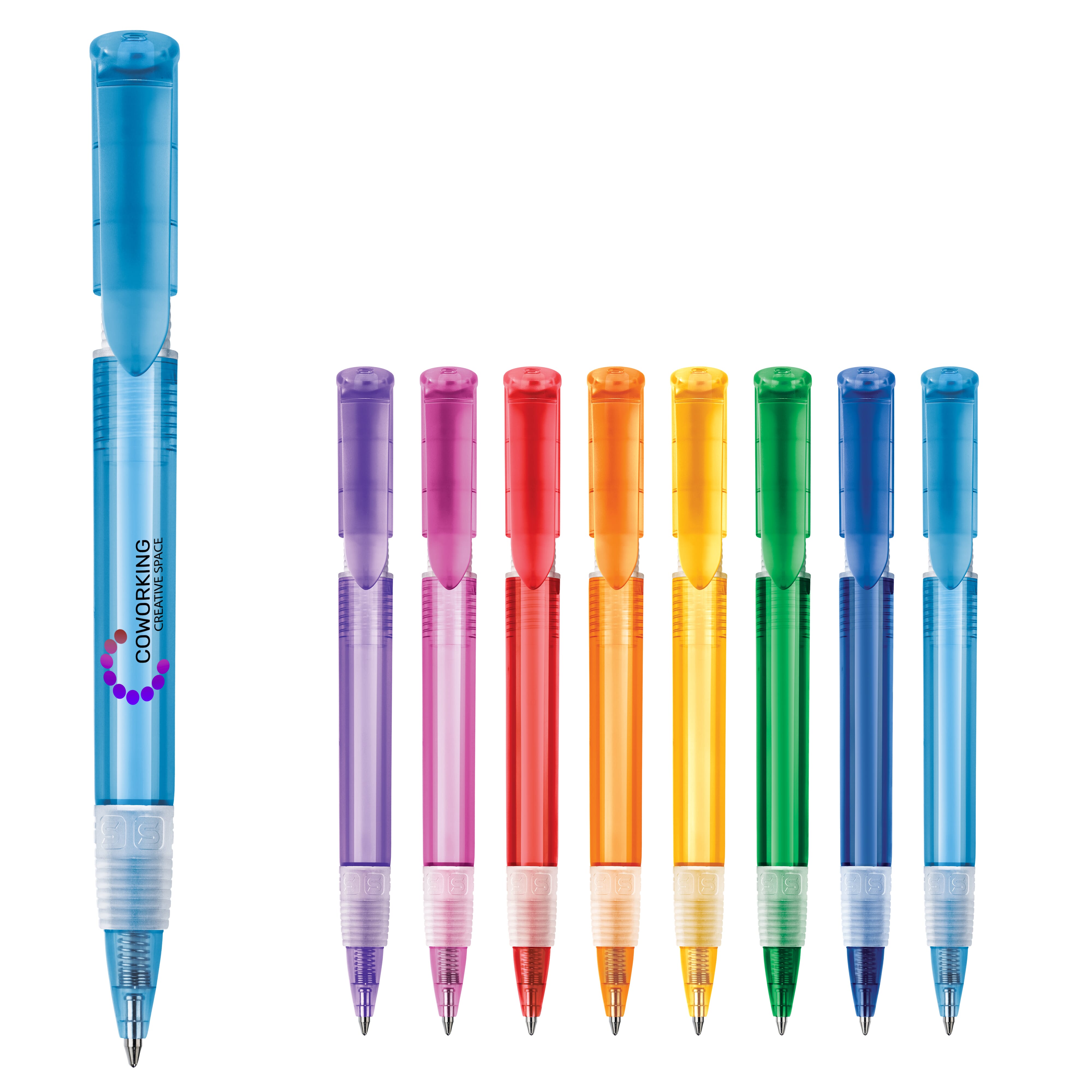 Der S40 Grip-Clear Kugelschreiber ist aufgrund seiner transparenten Farben und des bedruckbaren Clips, der dem Stift Stil und Charakter verleiht, und der transparenten gummierten Griffzone, ein beliebter Stift. Der Schaft kann einfach mit einem Logodruck veredelt werden. Druckkugelschreiber ausgestattet mit einer blau schreibenden Toppoint jumbo-Refill-Mine. Der Hardcolour Kugelschreiber besteht aus ABS und wird in Europa hergestellt. Ab einer Abnahmemenge von 5.000 Stück sind eigene Farbkombinationen möglich.
