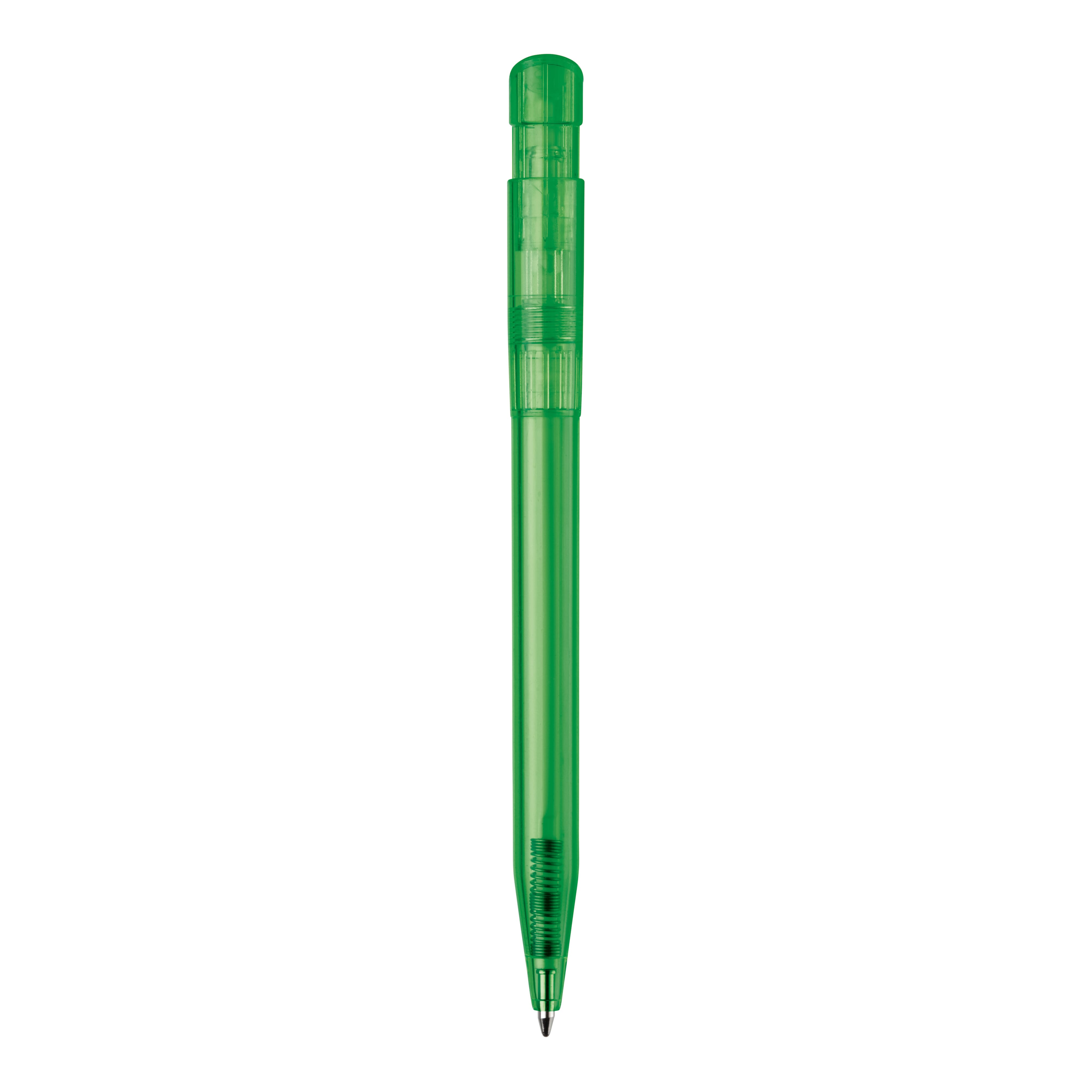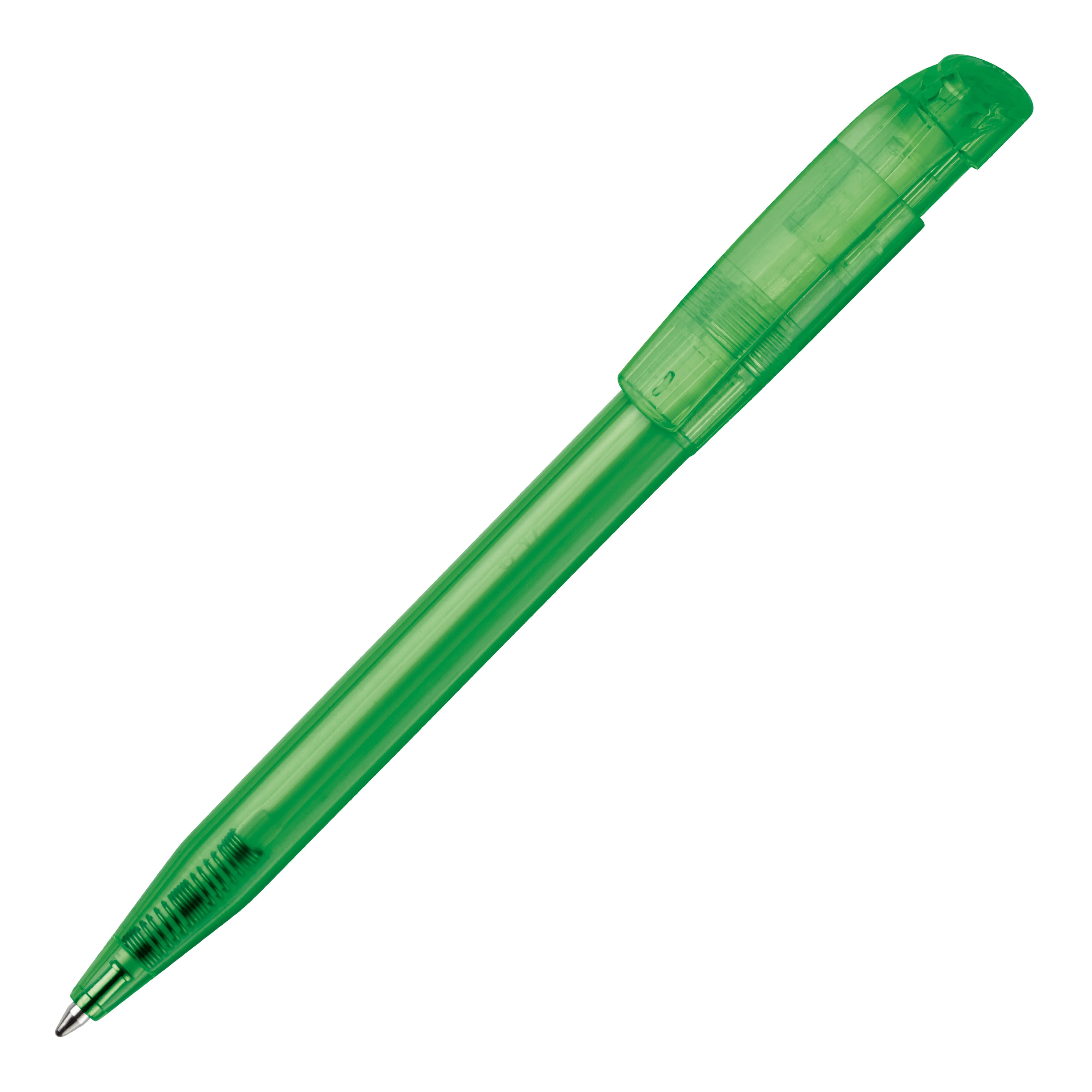 Moderner transparenter Kugelschreiber mit gebogenem Clip. Ein beliebter Werbeartikel wegen seiner großen Druckfläche. Druckkugelschreiber ausgestattet mit einer blau schreibenden X20-Refill-Mine. Druckkugelschreiber aus ABS, hergestellt in Europa. Ab einer Abnahmemenge von 5.000 Stück sind eigene Farbkombinationen möglich.