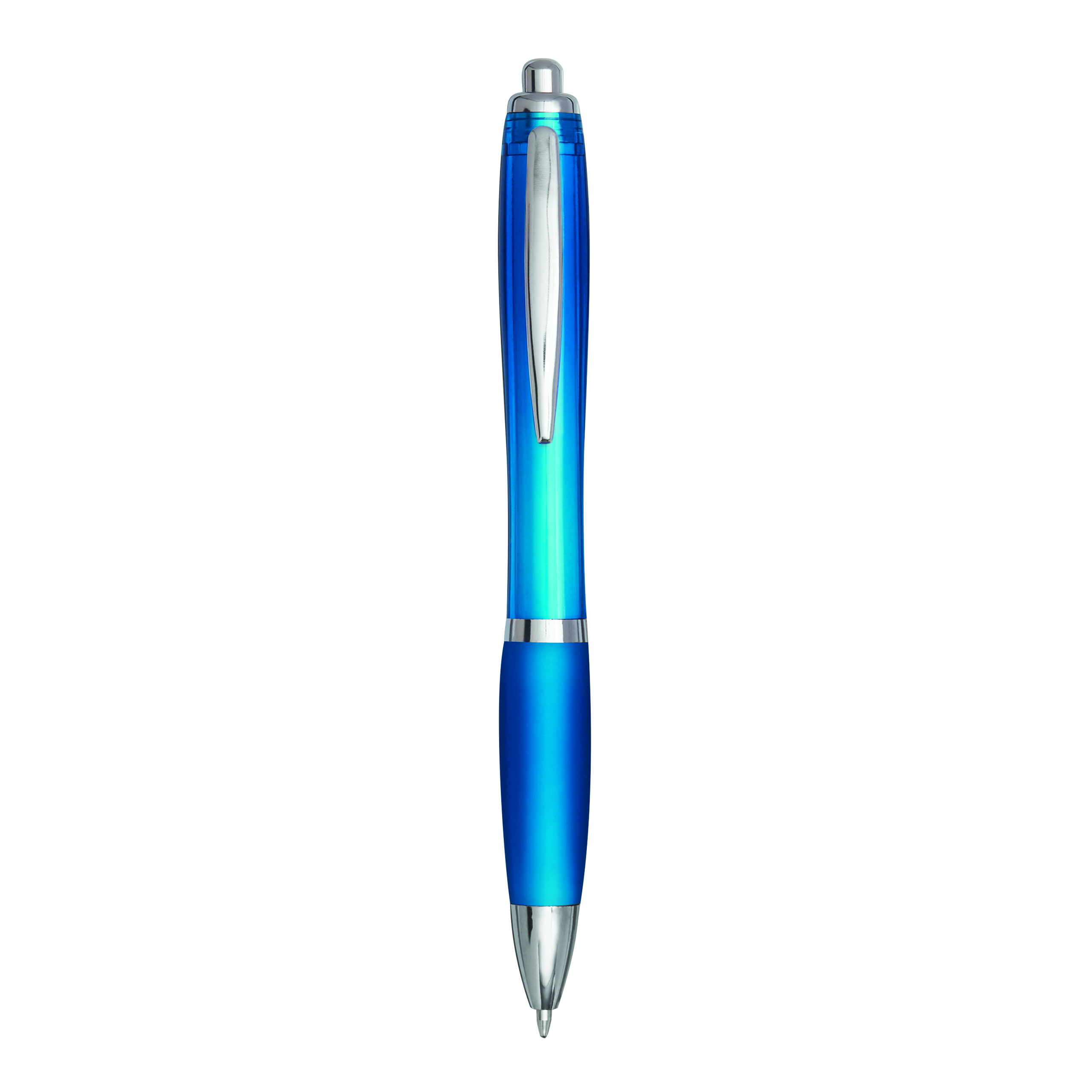 Kugelschreiber SWAYRABS: mit Schaft in taillierter Form aus recyceltem Kunststoff, gummierter Griffzone, Druckmechanismus, Großraummine, blauschreibend